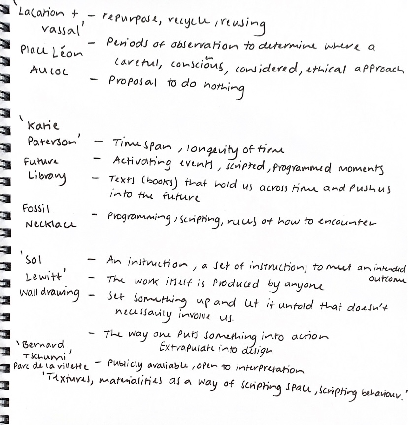 The work Wall Drawing is itself a representation of an instruction. LeWitt crafted a set of simple guidelines or a diagram for each wall drawing so that others, such as studio assistants, can produce the work independently. A set of instructions where produced in order to meet an intended or desired outcome. Script here is the way one puts something into action, extrapolate into design. To programme or set something up and let it unfold in a way that doesn’t involve us, the designer.