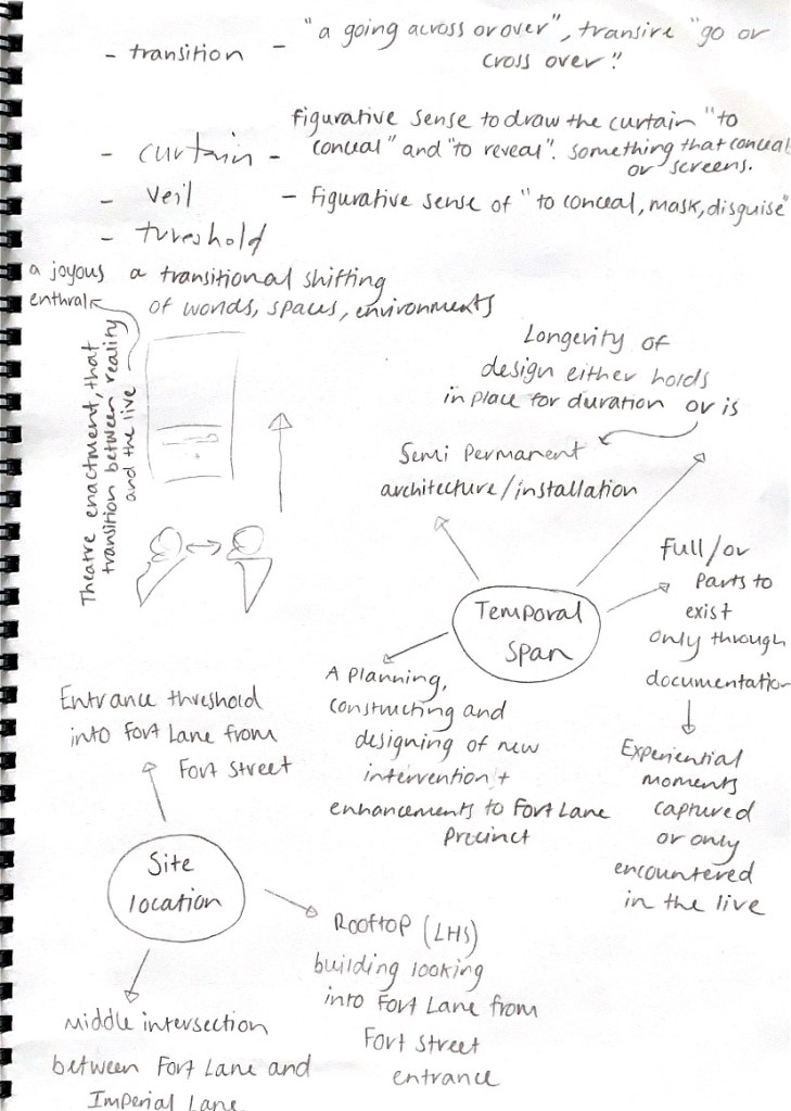 In conjunction with understanding the temporal span of my project, determining and identifying a specific site location within the entire Fort Lane Precinct that I intend to work with is vitally important. What part of the site captured my attention or interest to work with most, a moment where I saw a possibility, an imagining? Which site locations allow for a potentiality of explorations and interventions to be possible? Considering its inherent qualities, its orientation, heritage or industrial features, an internal building interior or external space within the lane or up on the rooftop, or even a threshold moment, a combination of spaces. These aspects of my specified chosen site will need to be carefully considered when designed and planning into the existing area. In order to begin breaking down these thoughts and considerations towards beginning to develop and shape the form I wish for my intervention to take, I mapped out and collated all my current ideas, concepts, perceptions and reflections both in relation to the site and how I responded to it through this cinematic lens. Seeing all my thoughts written down will help me towards building connections to clarify my conceptual interests and explorative direction of intent for my design intervention.
