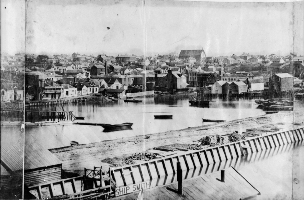 Looking south west from Point Britomart showing Commercial Bay during the early stages of reclamation, 1859