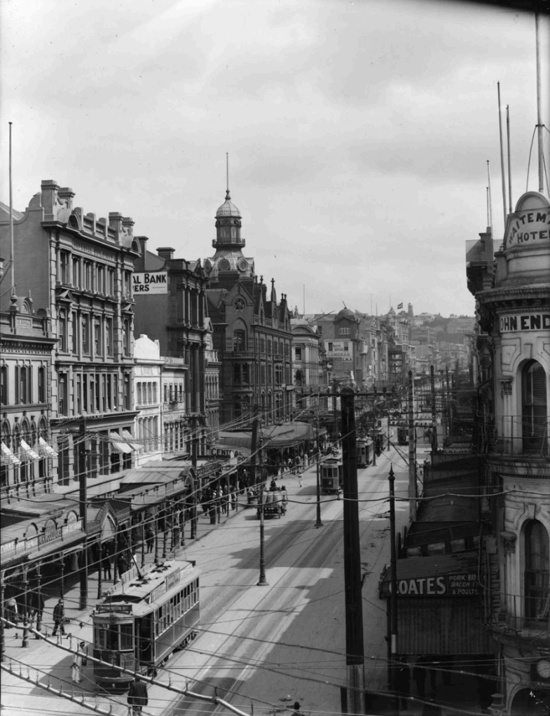 Looking south along Queen Street from Palmerston Buildings on the corner of Customs Street West, 1916