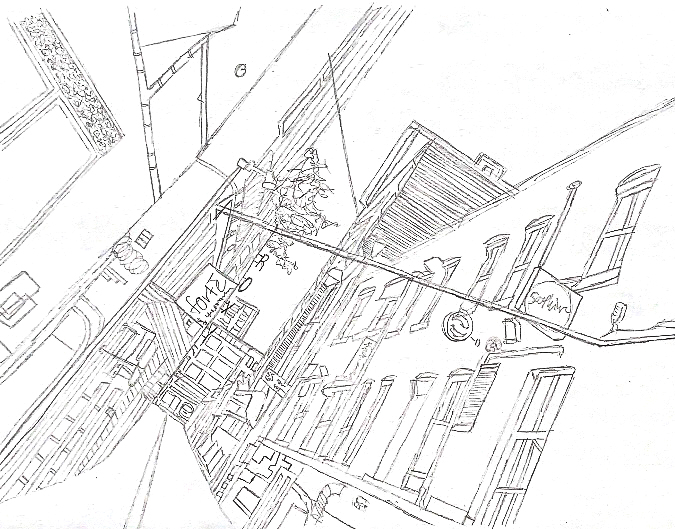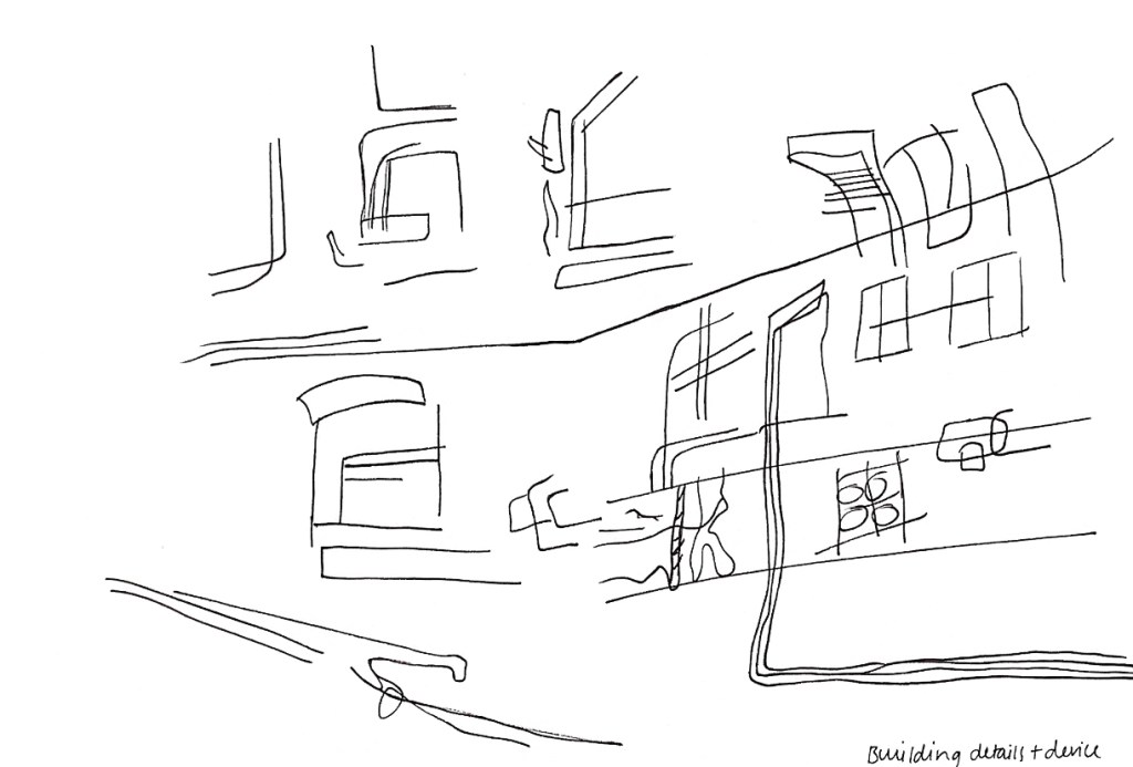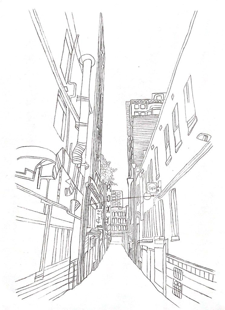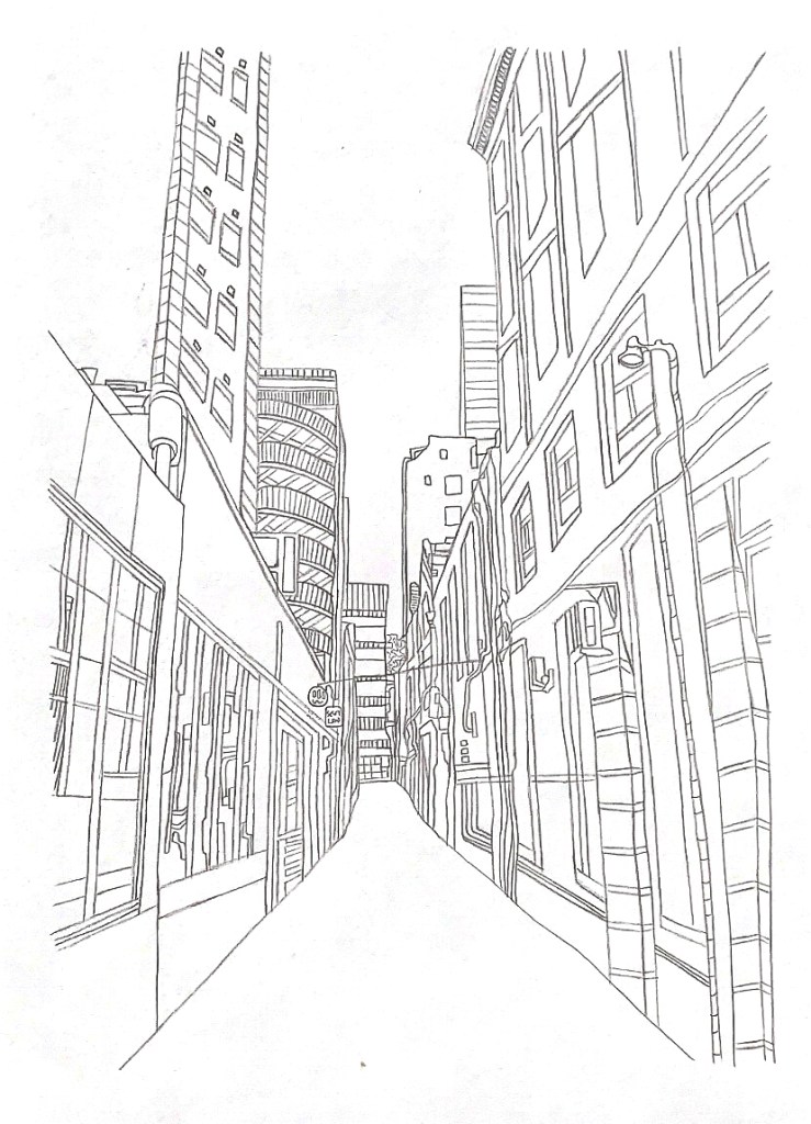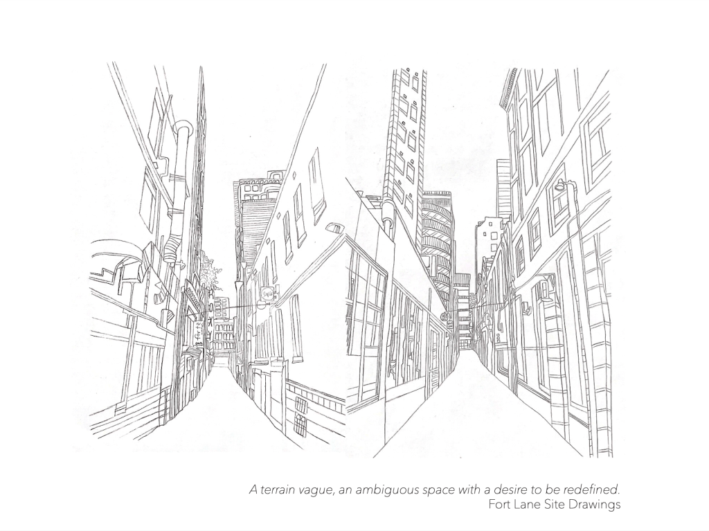 My initial site observations were in consideration of the surface, material and immaterial narratives present at the Fort Lane Precinct. Through this I reflected back over my site documentations and image sequences as a means to further investigate these active, in live moments. Line drawing is used as a drawing method to express the sharp, long verticals of the neighbouring building facades, the ones that stretch and draw your eye upwards towards the sky.