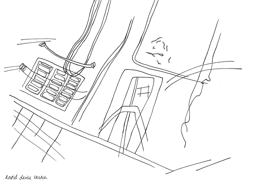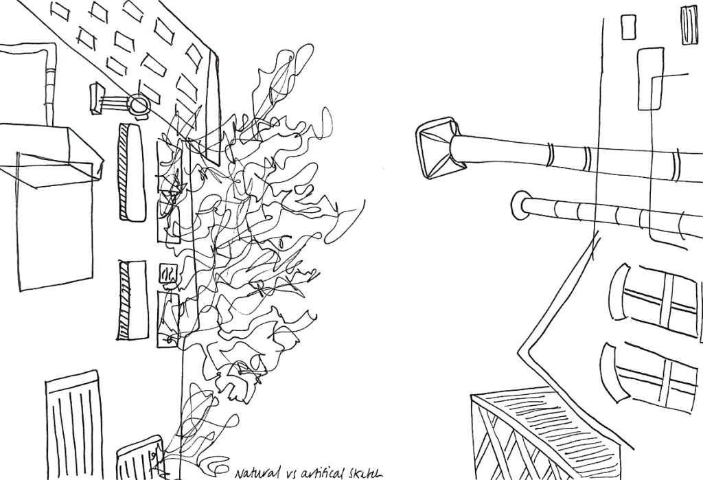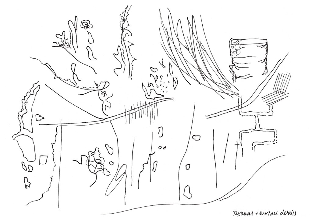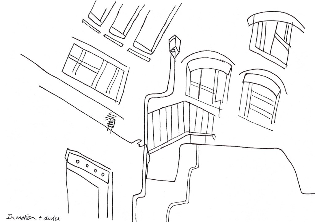 Line drawing used as another ideation methodology to capture and visually articulate movement in motion drawn from my cinematic device. Loosely, expressive lines represent the spinning, twisting, and shifting of heights and directions which generated the pendulum, swaying action that it allowed me to perceive the site in this completely new way, and with this completely new approach.