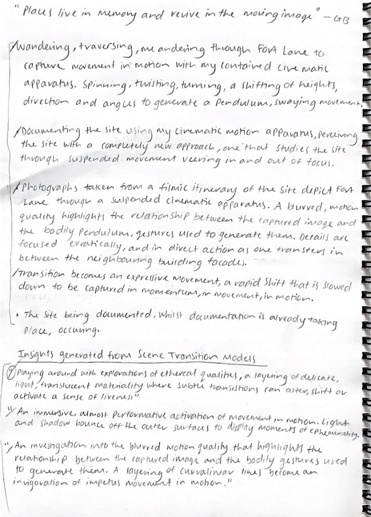 Another key part of my design process towards developing my design proposal, was through comprehensive script writing, iterative scene transition analysis and surface model making. All these experimentations allowed me to further enhance and begin to shape new ways of exploring the conceptual frameworks within my site map. Initially by looking over the collection of spatial models generated from analysing the scene transitions between my site imagery, did it allow me to select which models were best reflective and insightful towards the development of my design ideas. These selective models established interior spaces through model making, as a means of revealing and unpacking the scene transitions between my site documentation imagery.