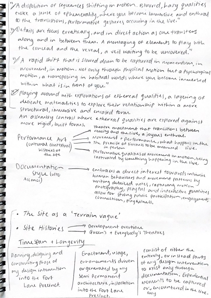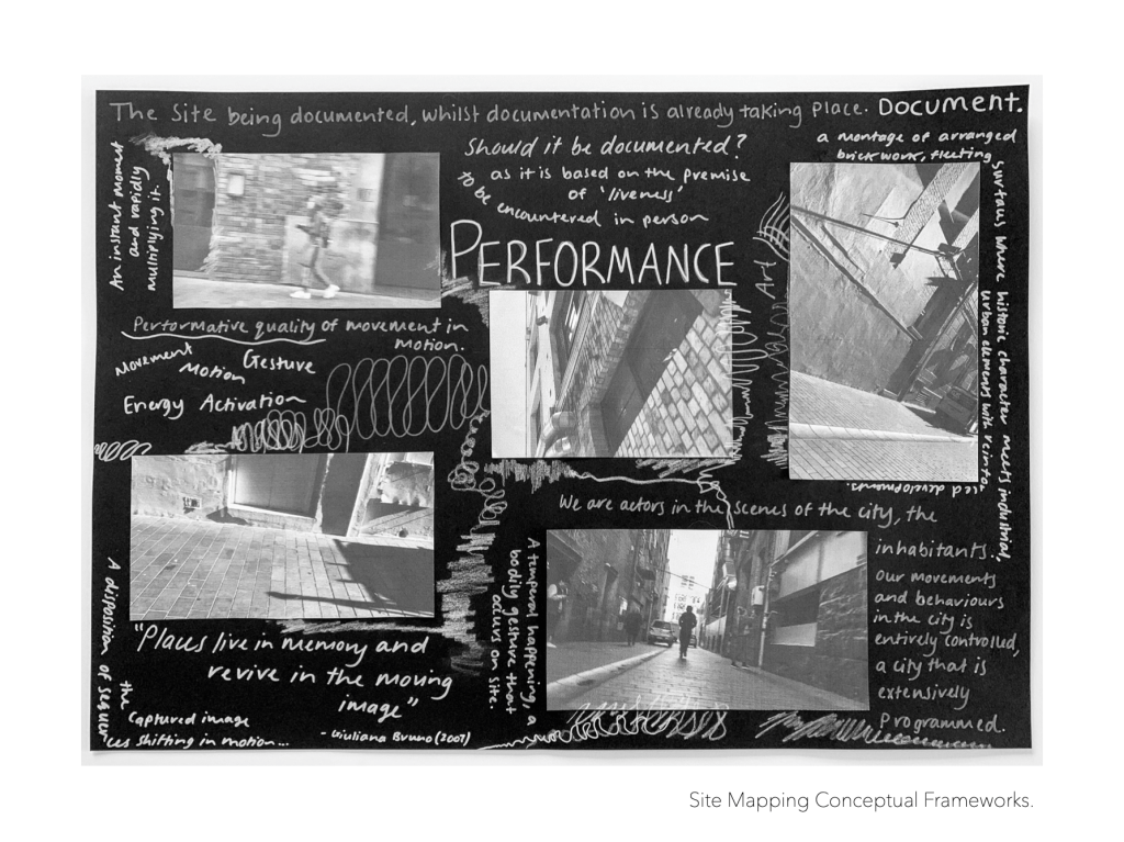 This site map combines all the key conceptual concerns of my design project, thoughts and insights drawn from my observation of the site and generated images. Expressing where my ideas are stemming from, what evoked them or made me inquisitive within this kind of design avenue. A means of visually communicating and collating all of these initial thoughts I had towards the Fort Lane Precinct.