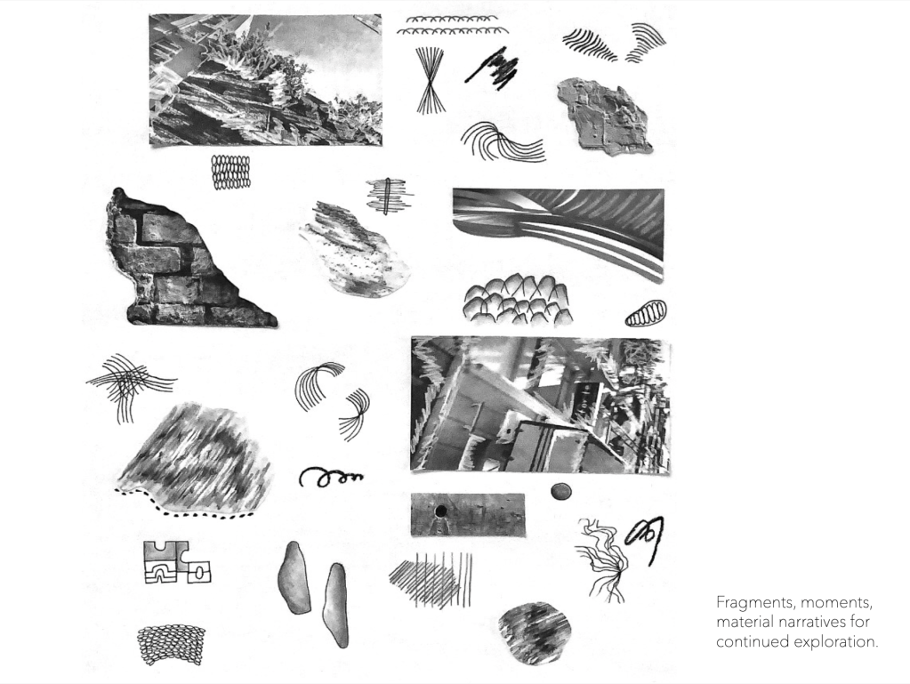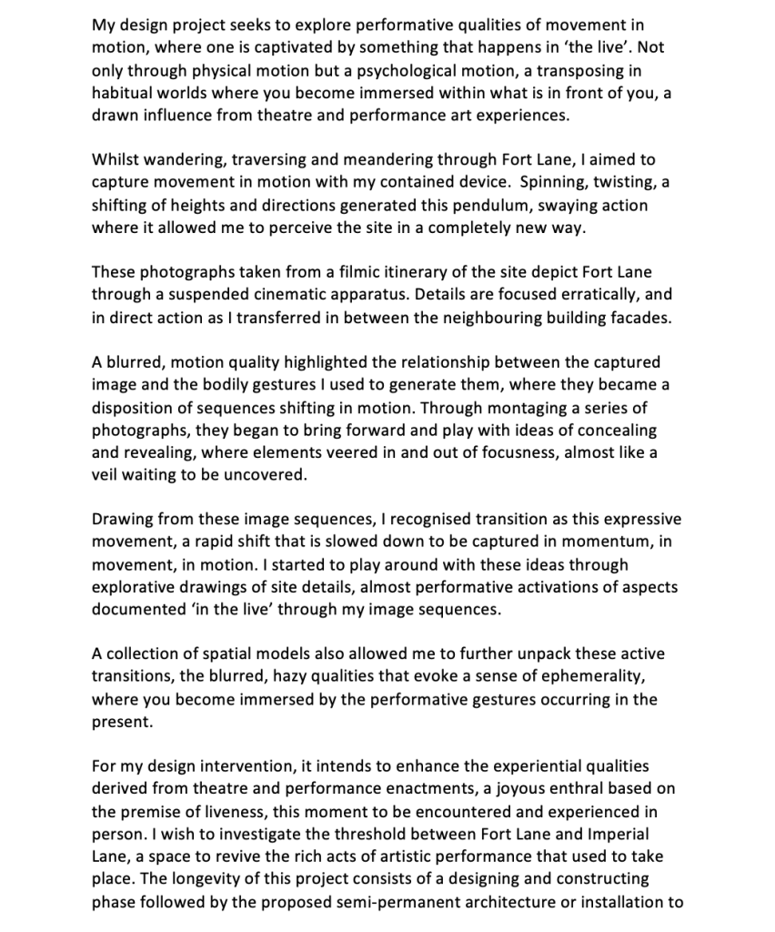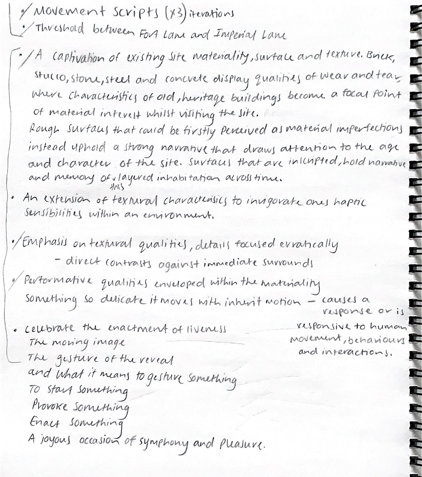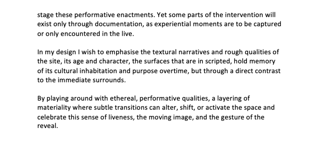 As a major part of our design presentations, we were to generate and write a ‘design pitch’ as a means of analysing and reflecting over all of our progressive work so far in relation to the project brief. To help us start this reflection, we were given an array of prompts for thinking through our projects. These prompts covered our main focus and relations to site, articulation methods, explorative design workshops, and material + design processes. By going through each prompt, it was incredibly beneficial towards me gathering, reflecting and synthesising together the conceptual frameworks that I have built up. This clarified what components needed to be expressed within my design presentation, as well as the best way of verbally articulating my generative design thoughts, observations and insights from each exploration. Looking over all my process work, visual diary, explorations and experimentations from the studio workshops did I began answering all the prompts to help me form the basis of my presentation and design pitch.