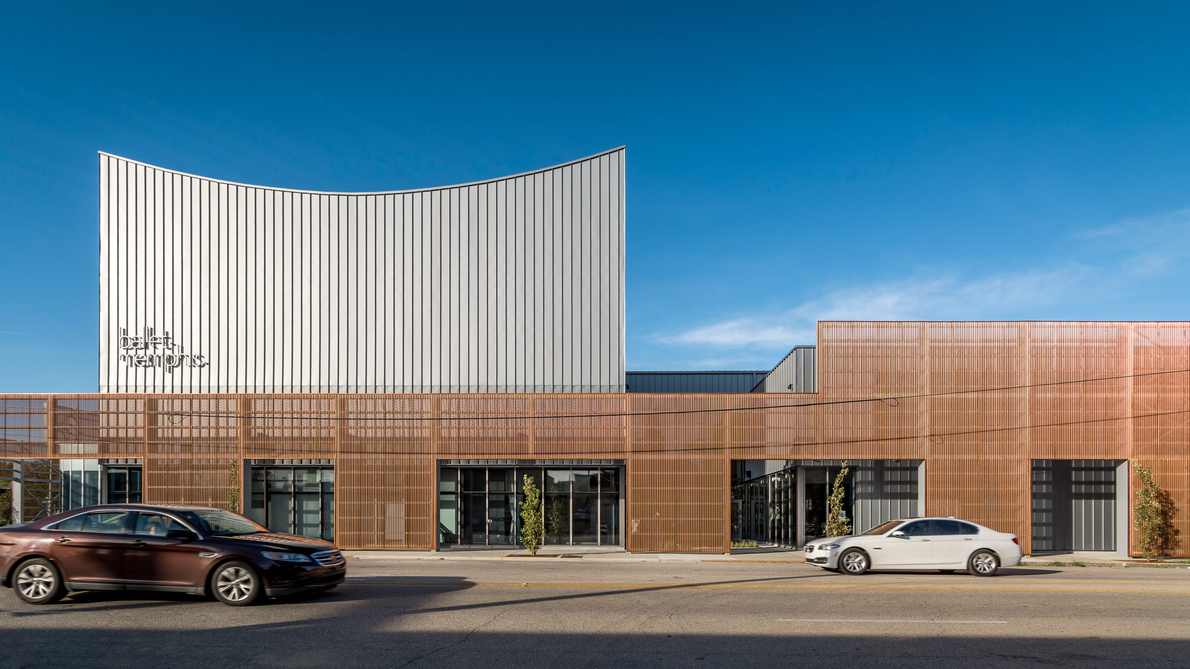 Rectilinear in plan, the building is topped with a sculptural, metal-clad volume that rises high above the roof. Another distinctive feature is a perforated copper screen that wraps the front facade. Portions of the brise-soleil are cut away to reveal large stretches of glass, which provide views into dance studios.