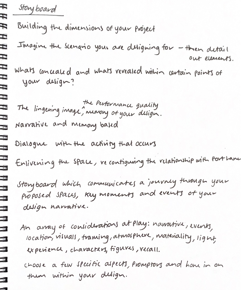 Building a visual dialogue between expressing key aspects of our design proposals and the exisiting site. By composing and developing a detailed storyboard it will allow for these established connections to start to be imagined, perceived and showcased as a communicative method that forms a sense of understanding. This storyboard should communicate a journey through my proposed spaces, and articulate key moments and events of my design narrative. As part of my storyboard, there are an array of considerations at play that need to be taken into account: