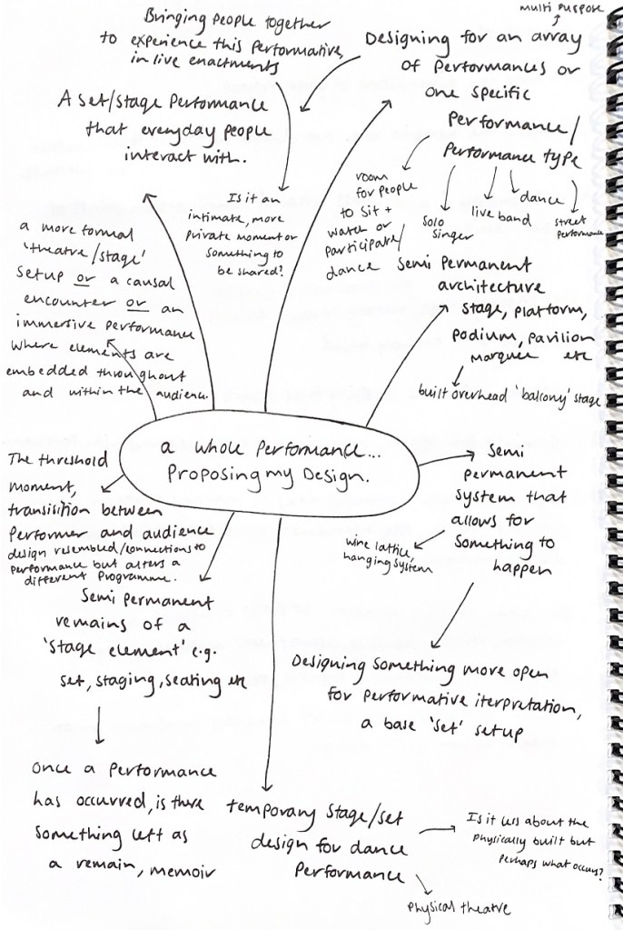 How could I explore this threshold moment, transition between performer and audience, where the design resembled connections to performance but alters a different programme? A more formal ‘theatre, stage’ set up, or a casual encounter, or an immersive performance where elements are embedded throughout and within the audience. What is the permanence or temporary nature of my design proposal? Is it a form of semi permanent architecture, stage, platform, podium, pavilion, marquee? A type of semi permanent system that allows for something to happen, designing something more open for performative interpretation, a base ‘set’ setup? Or a completely temporary intervention design that only last for one particular performance action? Are there elements of these in live moments, something left as a remain or memoir? Something that helps one to reminisce and remember the experiential environment that once was.