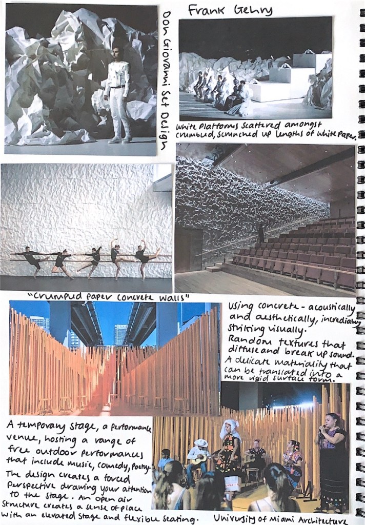 Scenography, the practice of crafting stage environments or atmospheres for a particular performance action or outlay. These performative environments can be composed of sound, light, clothing, performance, structure and space. How can my design derive from influences of scenography and the design qualities embedded within it. Spaces that uphold and support the performative, in live moments.