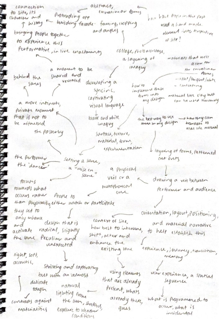 Expanding from these notions, I began mind mapping out an array of potential explorative ways of creating this kind of design proposal. One that investigates into this idea of performance, performative qualities, movement in motion and the premise of liveness and what that could entail. What type of intervention am I wishing to implement into the Fort Lane Precinct? In order to start unpacking these discoveries, I set about asking myself various questions in relation to the array of possibilities for how my proposal could proceed. What is PERMANENT and what is TEMPORARY?