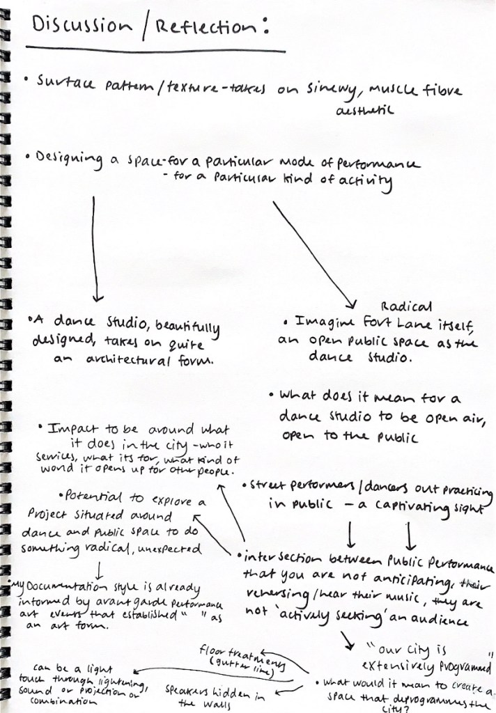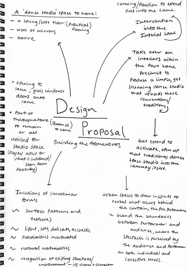 From our chat I was able to start developing a more comprehensive vision for how my design intervention would interplay into the Fort Lane Precinct along with the type of impact I was wishing to create. She questioned how could I develop a practical studio environment but with a radical, unsuspected approach, fusing together both of my considerations to create this traditionally influenced dance studio space in a way that is open to the public, the passerby. An urban space that draws insight to reveal what occurs behind the curtain, the pre performance, the rehearsal space. One that blends the boundaries between performer and audience.