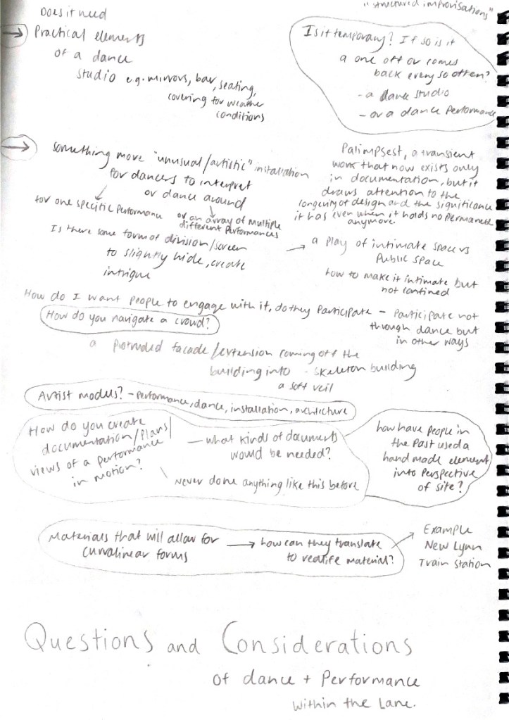 These considerations I began questioning in relation to dance and public space. Does my design proposal uphold to more traditional, practical elements of dance or is it something more unusual, an artistic installation of sorts? What is its temporality? Is it fleeting or one off re-arriving every so often? These new investigations and developing insights into my design I was able to further explore, ideate and even reconsider when discussing these with my tutor. Her incredibly beneficial input allowed me to develop a whole new reconsideration for how this proposal could be approached in relation to my conceptual frameworks.