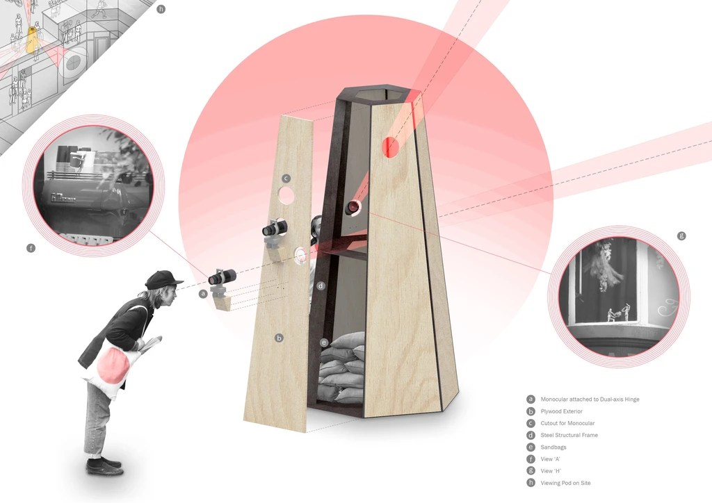 An example work we collectively reviewed over as a class which demonstrates and showcases their work with really relevant and clear documentation imagery, is the project I Spy With My Little Eye. A public installation into Aucklands Lower Vulcan Lane that consisted of three pods. Monoculars were fixed to each pod which activated particular moments throughout the lane with small scale wooden mannequins. The documents they produced where incredibly clear as to what they were anticipating to create, compose and implement into the exisiting site space. Through these images it allowed us to understand their design process and how the public installation would work into its context. By taking and using this project as a clear example I wish to create documentation that is clear in its communication and highlights the most important aspects of my design narrative, just as these designers have done so here.