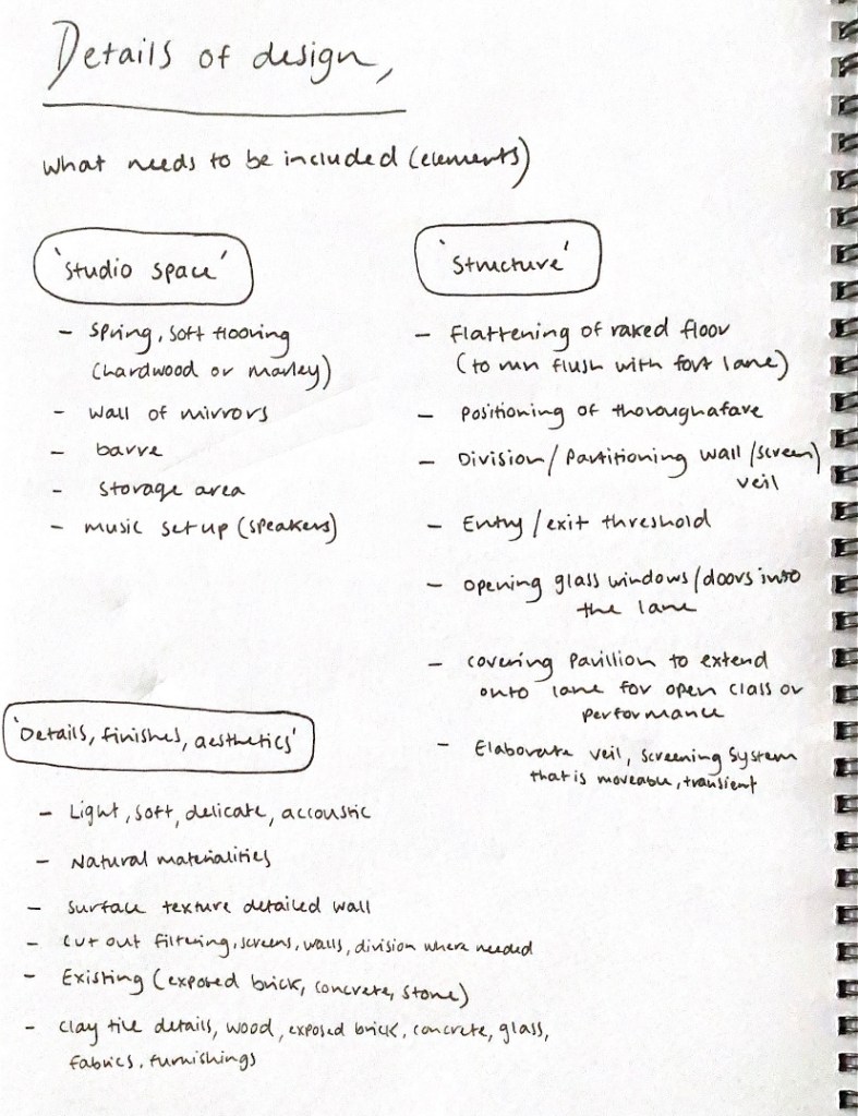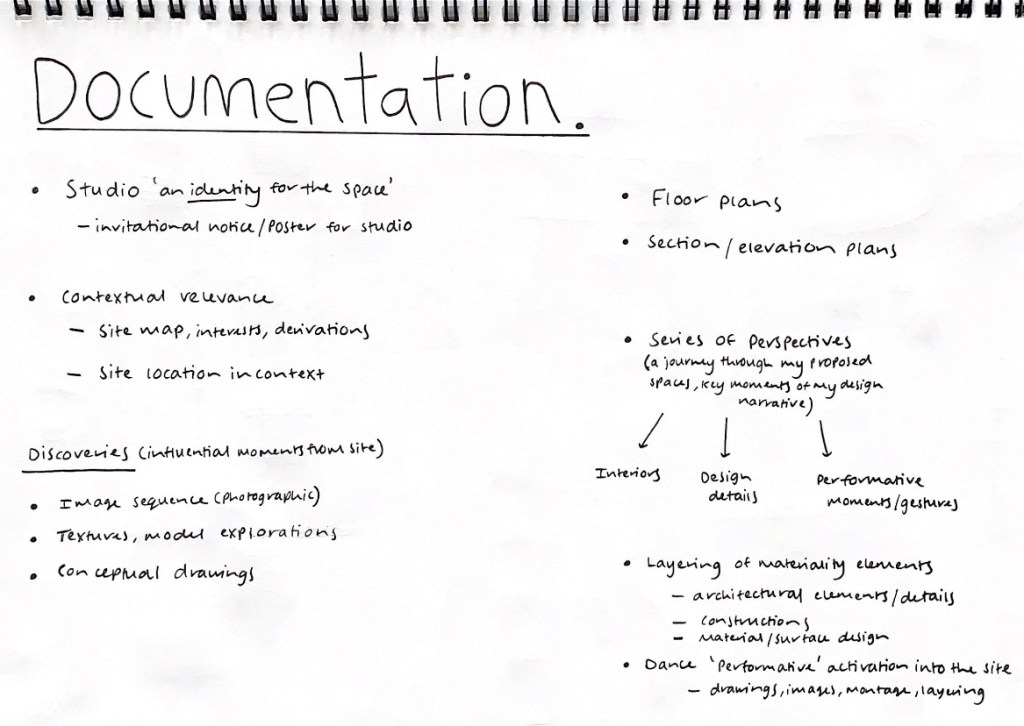 These documents will be inclusive to a studio identity (for programming, performance space, awareness and establishment within the dance community/industry), contextual relevance through a site map and site location in context, my discoveries and developed process work, a set of drawings containing floor plan, sections and elevations, a series of perspectives to show inhabitation of design and a journey through proposed spaces (key moments in design narrative), along with design details and materiality elements.