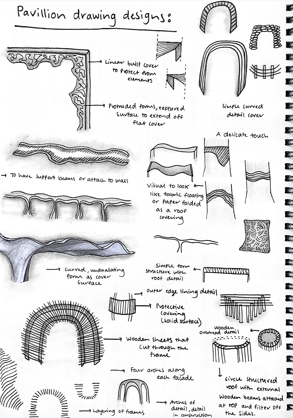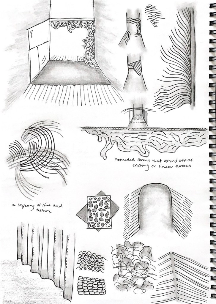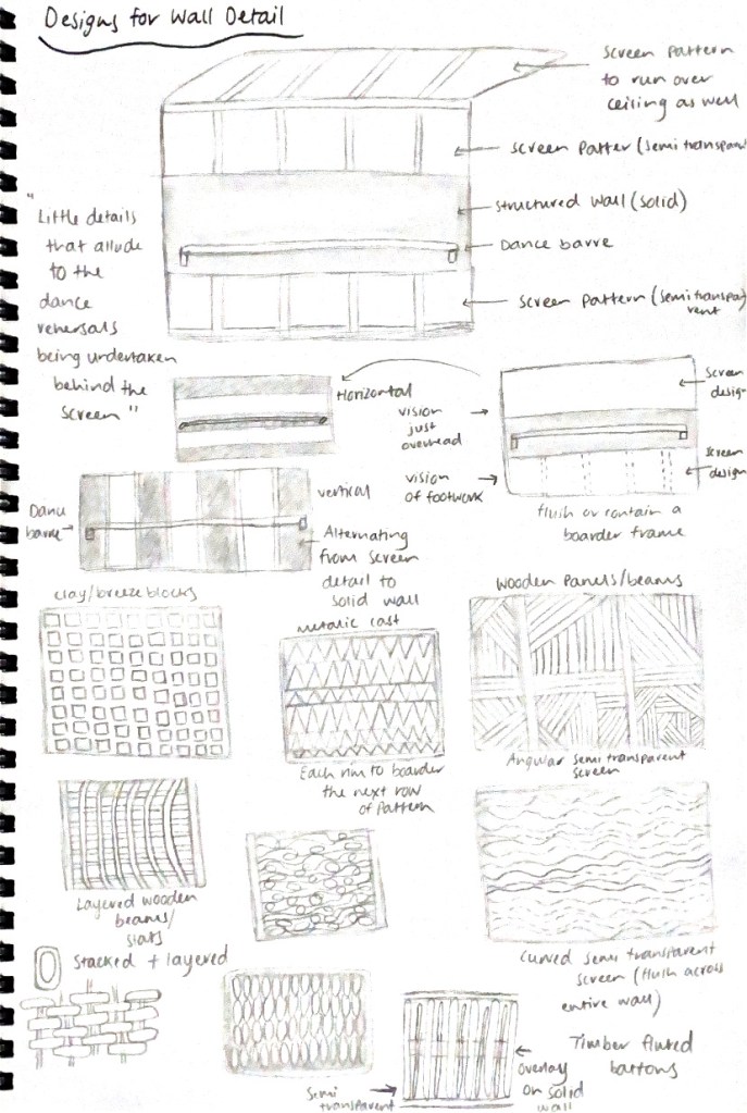 Firstly I began sketching out an array of potential design ideas for how my dividing thoroughfare wall detail and its screening pattern may manifest into the existing Imperial Lane site. For the partitioned wall feature dividing the dance studio and the thoroughfare access into Fort Lane from Queen Street, the main purpose of this designed element is to firstly established this division between function of spaces but also to cut out, filter and screen off where needed. By doing this it will allow for anticipated intriguement and curiosity, where subtle details allude to the dance rehearsals taking place behind the screen. They will be captivated by glimpses of screening movement, subtle articulate dance cues as well as music filtering through and around the space. For this detail it is import that its design remains semi transparent to allow for these sensorial moments to occur, which is why I began to sketch out an array of forms and surfaces that explored these frameworks in order to try visualise my ideas.