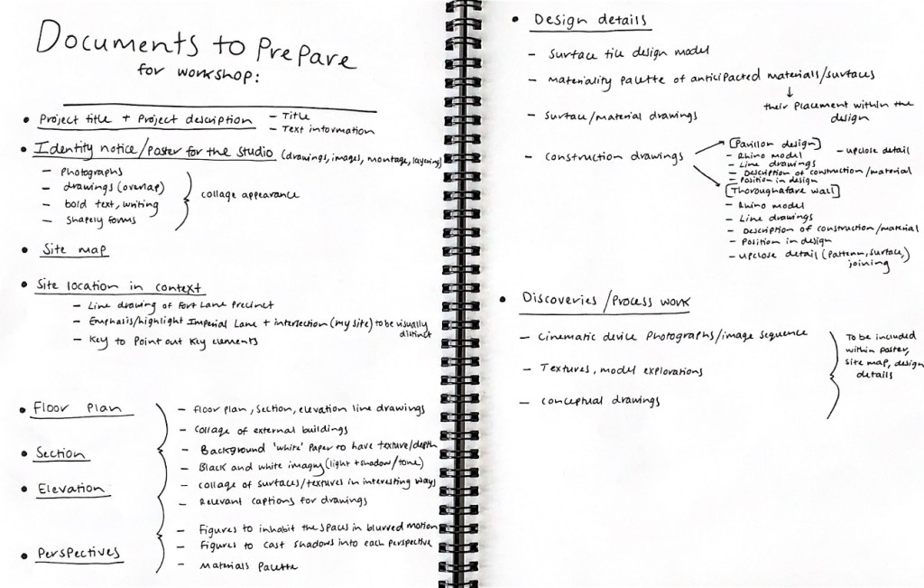In order to prepare for the upcoming co-design workshop, I began mapping out a series of key documentation I wish to produce for not only for this workshop but for the communication of my entire designed proposal and narrative. Documents in progress that I can keep developing and enhancing as my design evolves. Featured below is a list inclusive of an array of visual documentation I wish to draw upon, manifest and create for my own work.