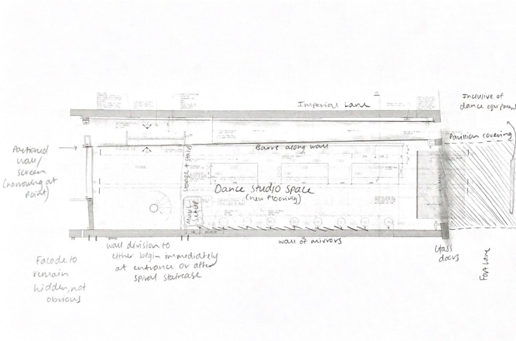 Using the new floor plan consideration above for repositioning the dividing wall to be offset on a steep angle, I played around with this layout using my digital model however I found this placement difficult to work with in terms of the functionality of the overall space. By trying to situate the wall on an angle, while still allowing access to the spiral staircase, the direct cut it made across the space to line up with the threshold into Fort Lane was too large of a divide. This made the space impractical in terms of the dance studio space as it become incredibly small and unusable in terms of the overall purposed of my design intervention. The thoroughfare would become excessively large and the studio would be far too small and practically unworkable. By trialing this design consideration within my digitally modelled space, it made it incredibly helpful for envisioning the design, in order to allow me to make a well informed decision for what would work and function best. As this offset dividing wall idea didn’t fully equate into the existing constraints of Imperial Lane, I proceeded to keep it running parallel to the external wall as this design works best both visually and practically. Firstly I constructed the main featured elements within my proposed design, the dividing wall detail and pavilion design, referring back to my ideation design drawings. From here I created all the designed elements for my dance studio into the building, where I could really start to bring my design to life digitally.