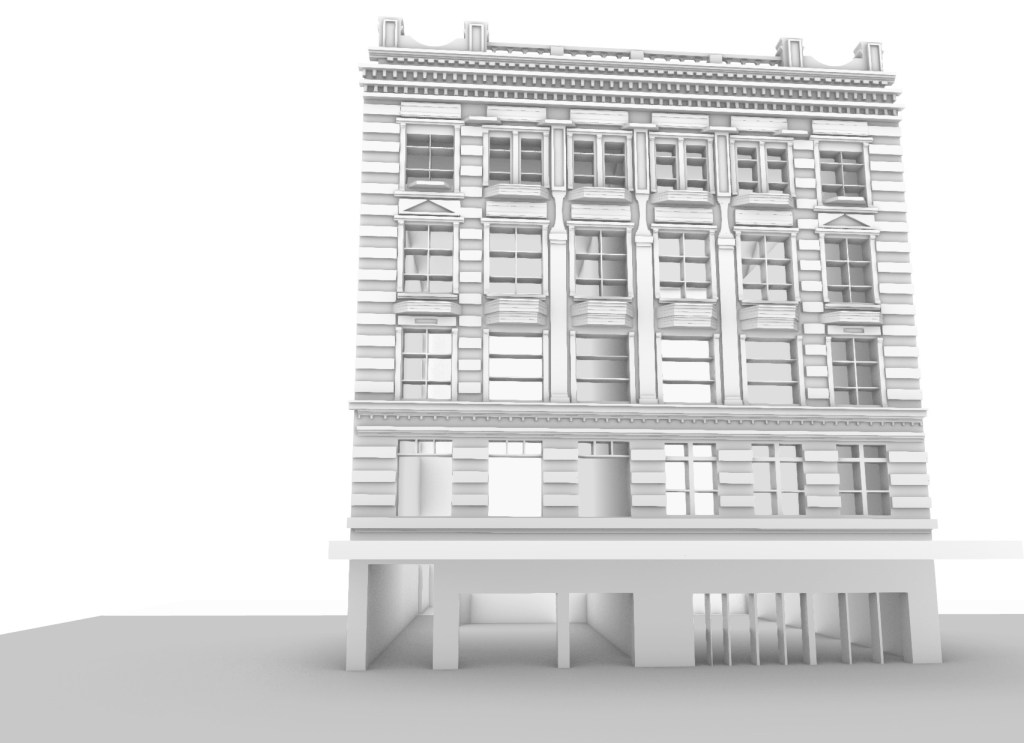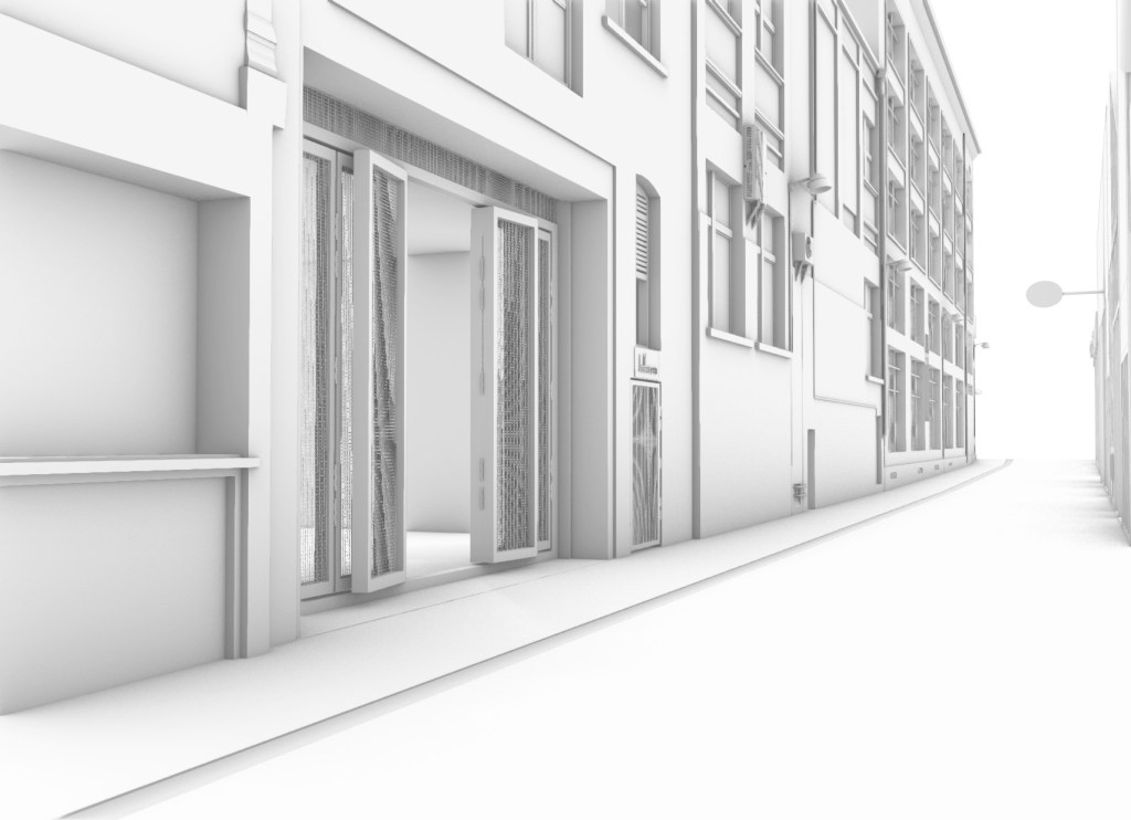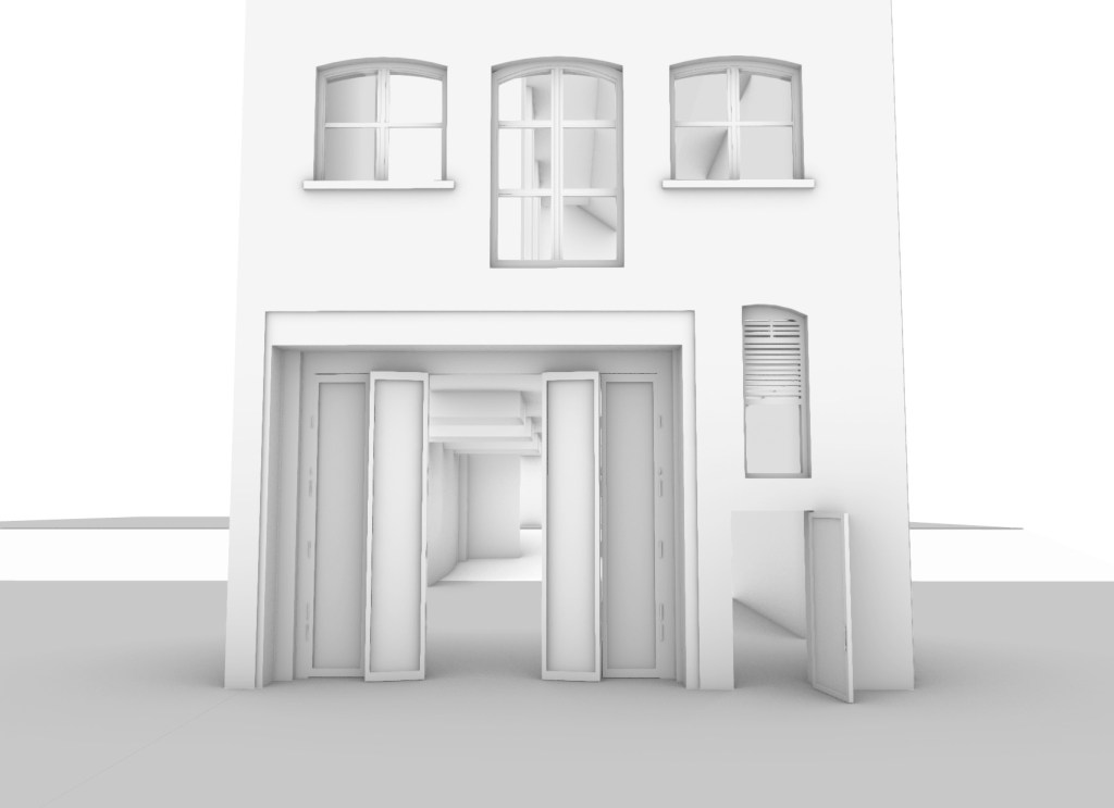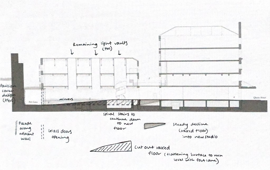 Once each site was constructed as its exisiting and current condition was I able to start making the structural alterations and relevant changes needed to implement my proposed design plan into the spaces. The main area I was working into was Imperial Lane as the varying internal structural changes needing to be made were consistent of: the exisiting raked floor to be cut into and flattened off to run parallel with the ground level of Fort Lane, a repositioning of the thoroughfare connecting Queen Street through to Fort Lane, changing the metal gate doorways to glass windows and doors, sectioning off our the dance studio space (internal walls), the hall running from Queen Street into Imperial Lane to have a raked floor to connect the two floor levels using the exisiting spiral staircase. Using these design elements and floor plans I started to intersect, construct and make these main structural changes and alterations to the exisiting Imperial Lane building.