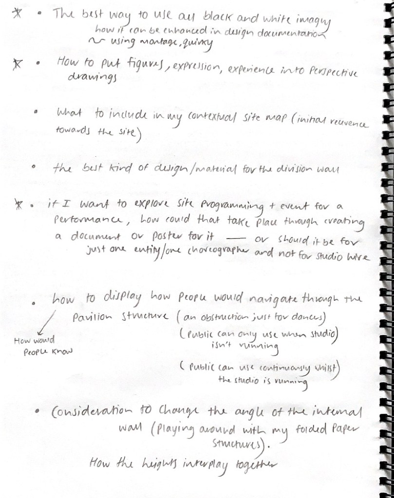 For todays studio session I was able to have a one on one conversation with my tutor to discuss how my design ideas and project are progressing in response to my conceptual and contextual frameworks. I had a really interesting discussion with her surrounding the detailing of my dividing wall between the dance studio and thoroughfare connecting Queen St to Fort Lane. I was able to explain my design intentions for this specific detail and how it would respond to the existing site and my intention for its inclusion and aesthetic. How the wall would compose of this patterned screen to form an opening down to the ground where the dancers feet would be, as well as just above their head height to run all the way up to the ceiling. She drew connections towards my previous surface studies and how these are emulated within this detailed design, the cuts spliced into this surface to make an array of openings. These could be informed into my cut out pattern, thinking about how it is looser or more folded at certain points to get the reveal.