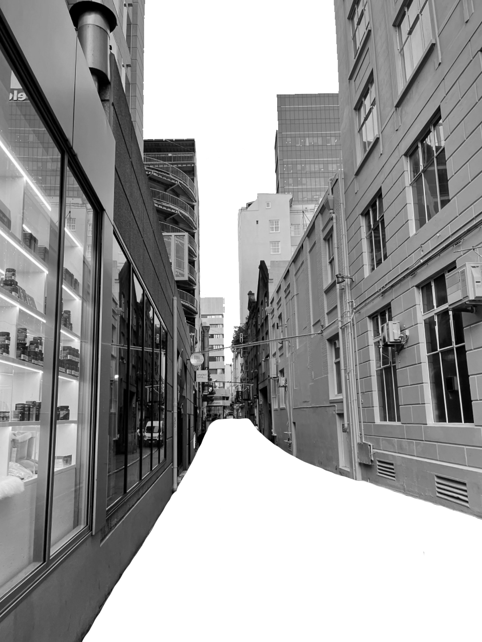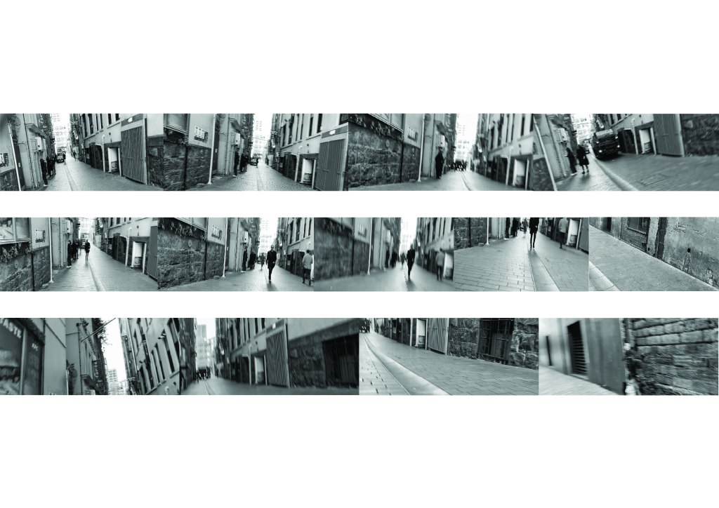 In order to fully build up these images to evoke the experience of what it feels like inhabiting this space, what it feels like to be immersed, embodied within in through a multiple view narrative, I would photomontage exisiting, external site references for contextual indication as well as activate the space with a series of figures. The Fort Lane Precinct and its surrounding building facades…