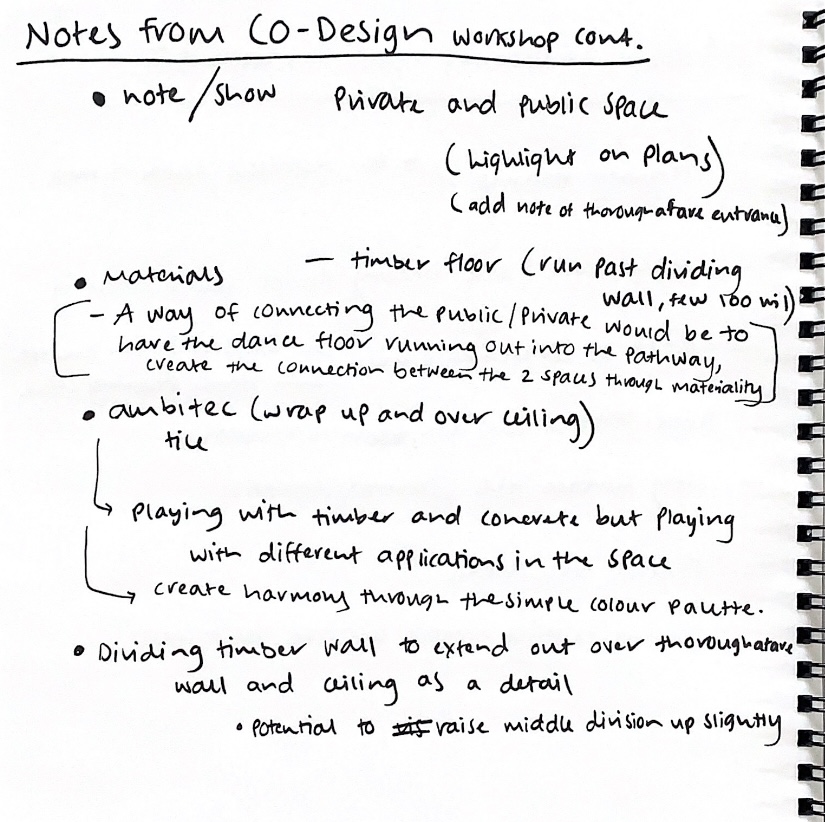 As the progressive design journey is a crucial part of our design documentation, I need to further capture why I decided to do a dance studio and how I came to the specific designed elements and their forms. During my presentation I was able to verbally articulate this when asked questions however it wasn’t visually represented or obviously shown in my documents. Highlighting the key process driven material that led to how and why I landed on a dance studio. She emphasised her direct interest and intriguement in this and why it is so important to prioritise in my work.