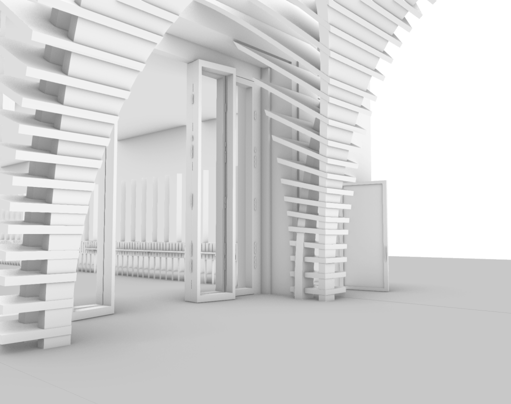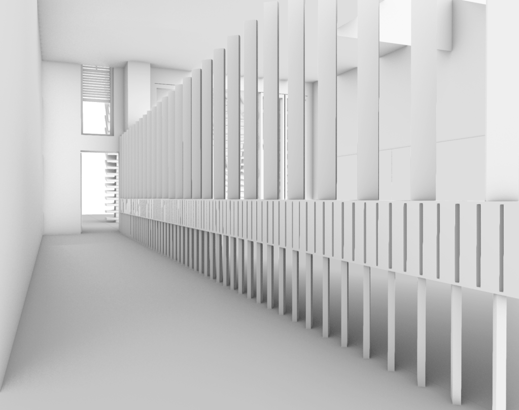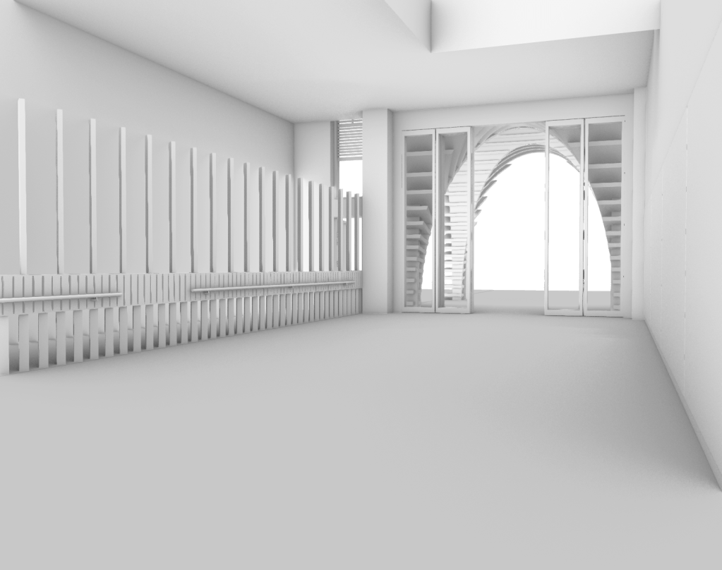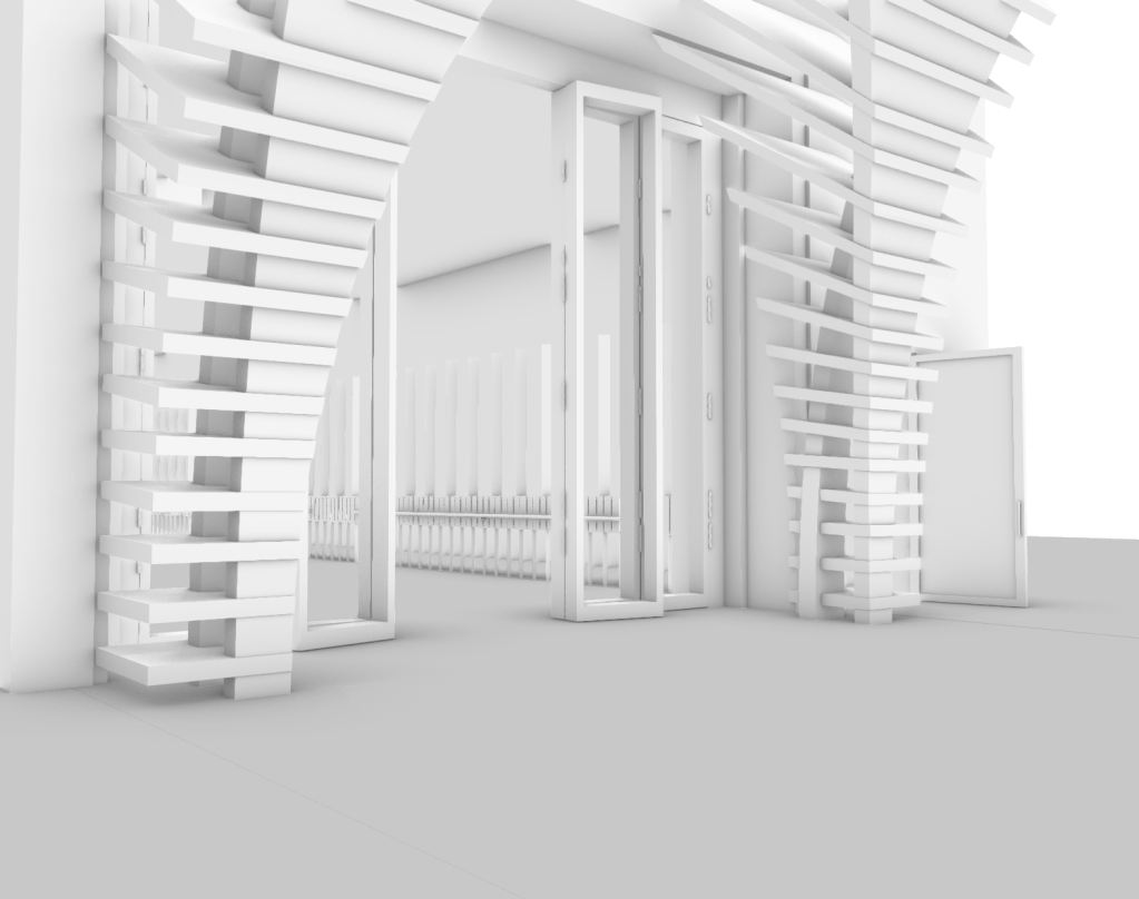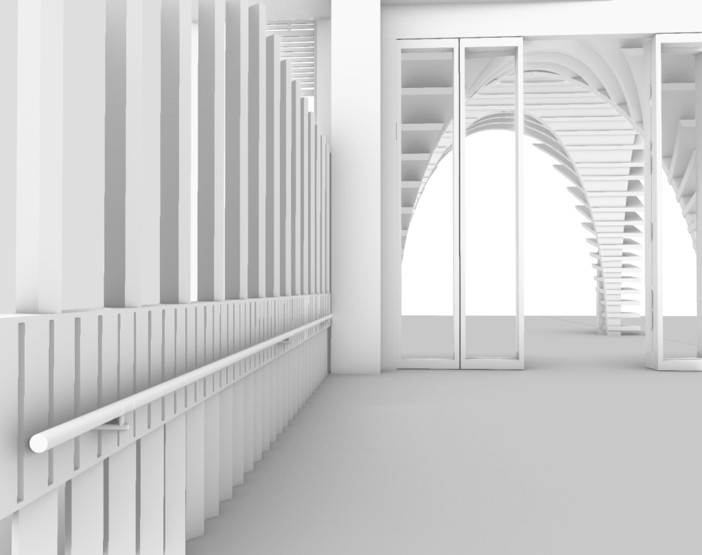Utilising my constructed digital rendered model of my design, I started capturing selective perspectives showcasing key viewpoints and elements of the progression throughout the space. Imagining what it would be like to inhabit and occupy. By composing and developing a series of perspectives, almost like a storyboard, it allows for these established connections to start to be imagined, perceived and showcased as a communicative method that forms a sense of understanding. They should communicate a journey through my proposed spaces, and articulate key moments and events of my design narrative. These considered perspectives will showcase a spatial journey through my design, the entrance threshold, thoroughfare lane, dance studio and pavilion thresholds.
