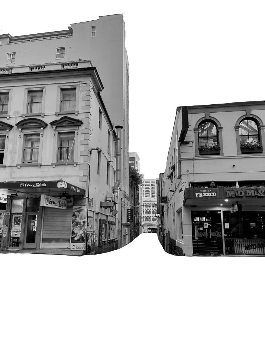 These buildings will help to establish a key contextual relevancy to my design to help the viewer understand its coherence within the existing site parameters. However I also wanted to further emphasise these site conditions by developing a site map for greater contextual understanding. This will allow me to highlight the direct areas into the Fort Lane Precinct that my design is located in, Imperial Lane and its intersection into Fort Lane. To develop this contextual documentation I gathered accurate site imagery of a birds eye view aerial map of the Fort Lane Precinct in amongst the greater Auckland City, where I will further highlight out these parameters, surrounding street names, and the area in which my design situates.