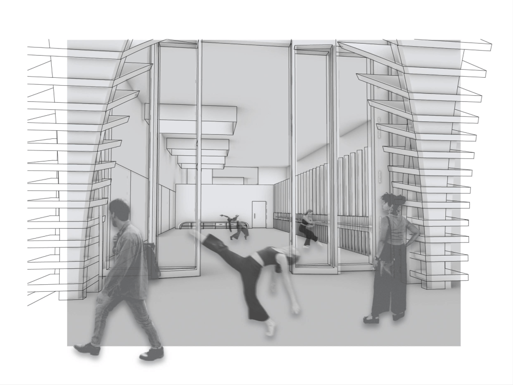 My previously captured photographic studies of a dancers natural instincts, whilst amid performance I wish to incorporate into these perspectival renders to simulate this feeling of occupancy. Along with these images I will utilise a selection of other figures to emulate the passer by, the general public witnessing these performative actions coming from within the dance studio, as well as a figurative dance class taking place along with dancers making their way to the rehearsal space. Considering the various different occupancies and roles that would potentially take place within my design intervention.