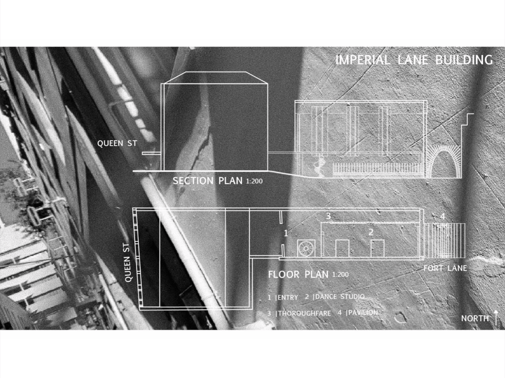 In order to showcase my proposed design, a key part of my documentation stems from informative plan, section and elevation drawings of Fort Lane and the Imperial Lane building. For my documents, I constructed a Floor Plan, Sectional Plan and Elevation Plan along with a series of section views and perspectives of both my detailed elements consistent of the pavilion structure and thoroughfare dividing wall. With these drawings I will be able to further develop them by adding critical design details such as indicative titles, scale and north point.