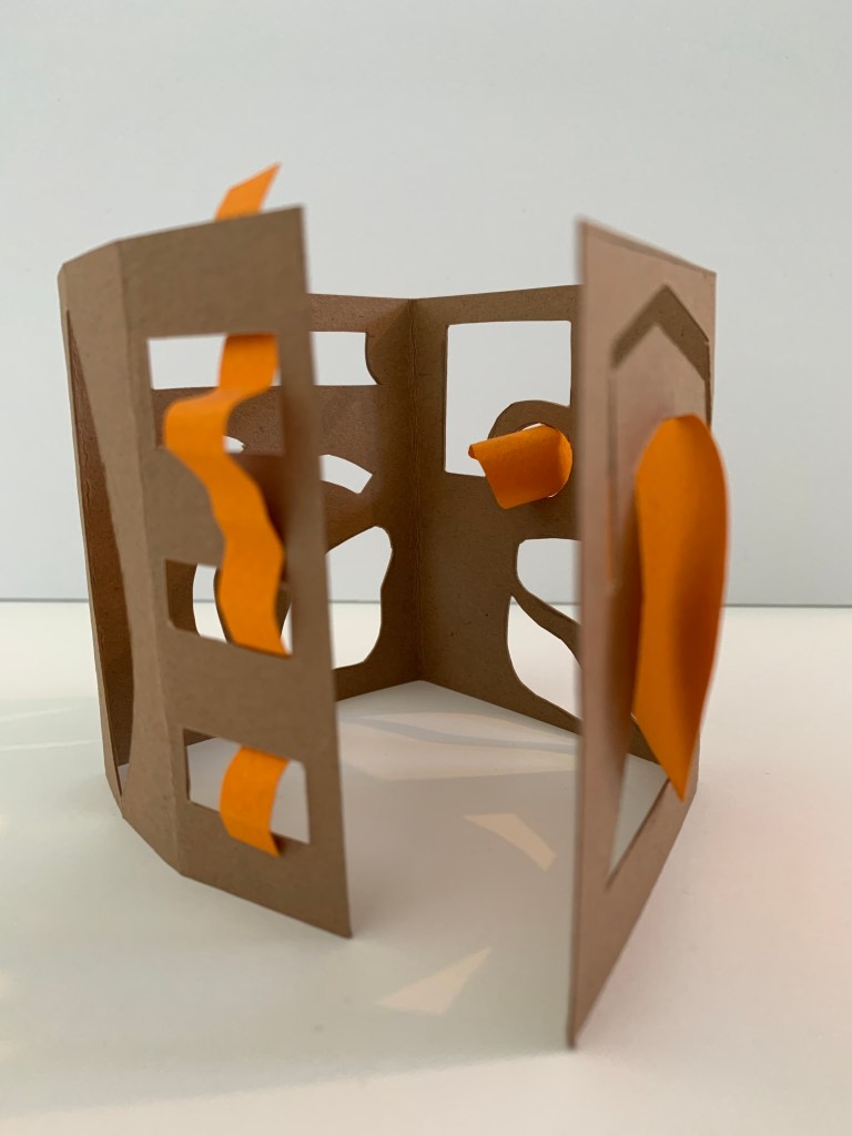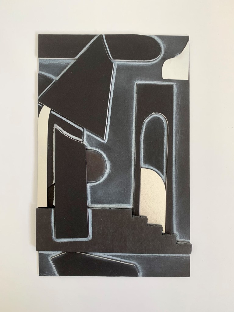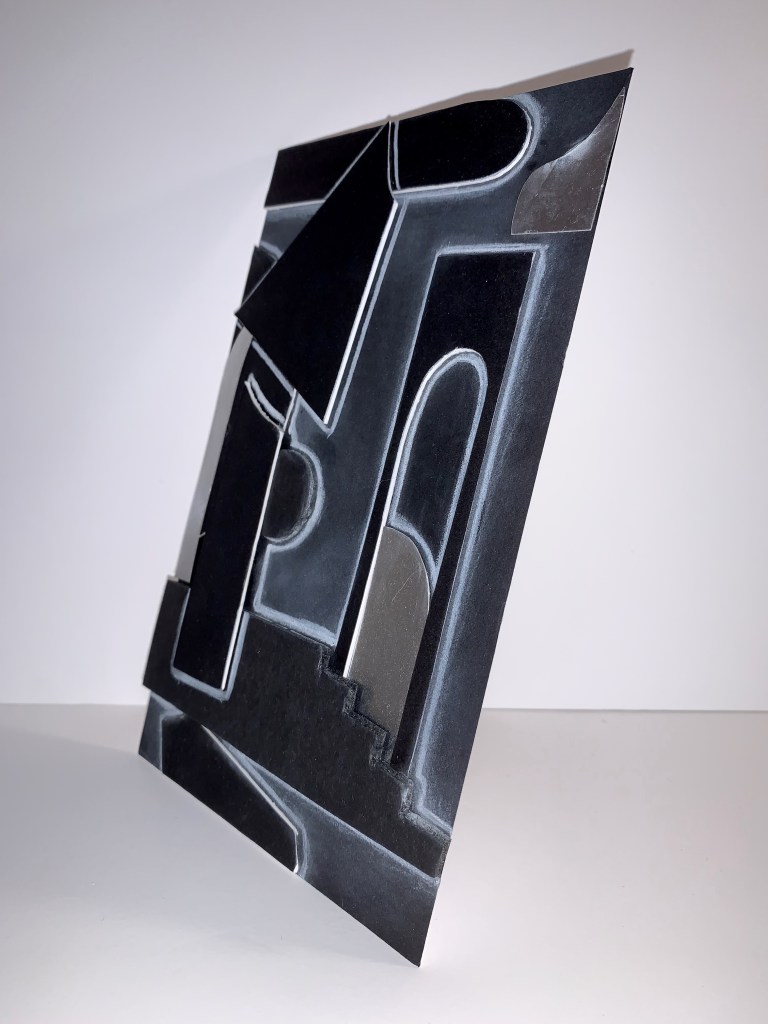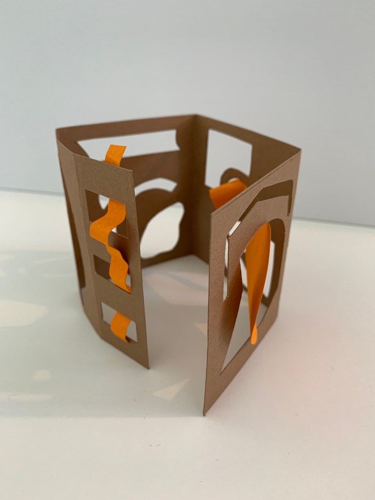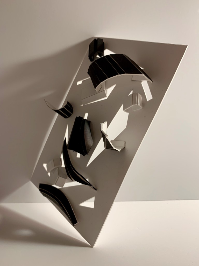 In this design workshop we were focussing on the production of 3D collage models, starting to consider what aspects of our 2D collages could be developed into 3D forms and spatial qualities/atmospheres. We were asked to produce 3 intersecting colour models within a spatial volume of 100mm x 100mm x 300mm. The first model I produced intersects volumes and light, considering how one volume connects to another.