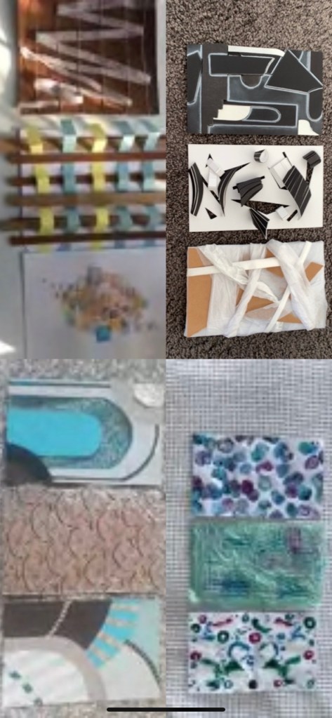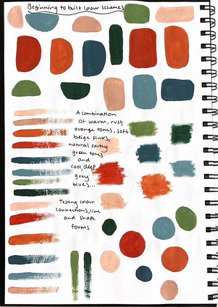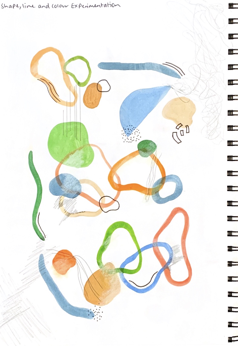 I also started to play around with shapes, line and patterns, based off observations from my colour mapping notes and sketches, by using different colours and creative mediums to experiment with layering, juxtaposition and contrast.