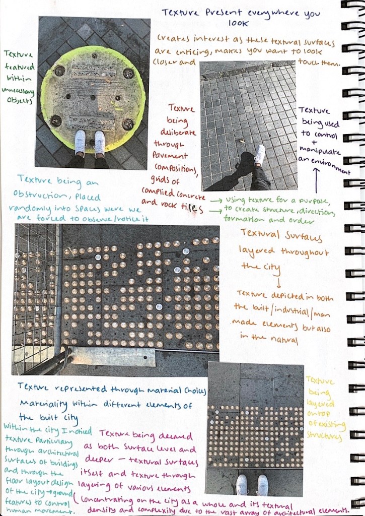 I also created coloured sketches, drawings and textural rubbings from my observed surroundings whilst on our walk in the city.