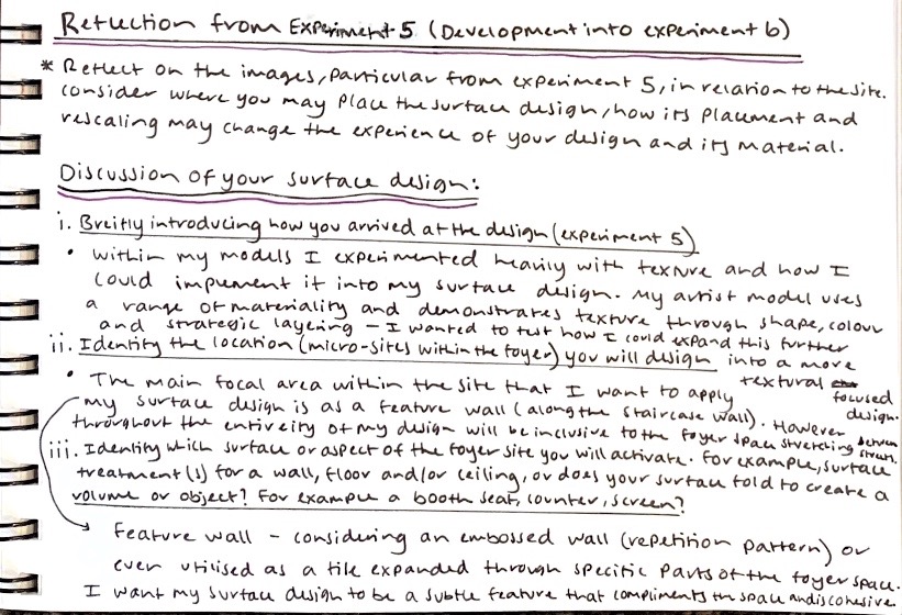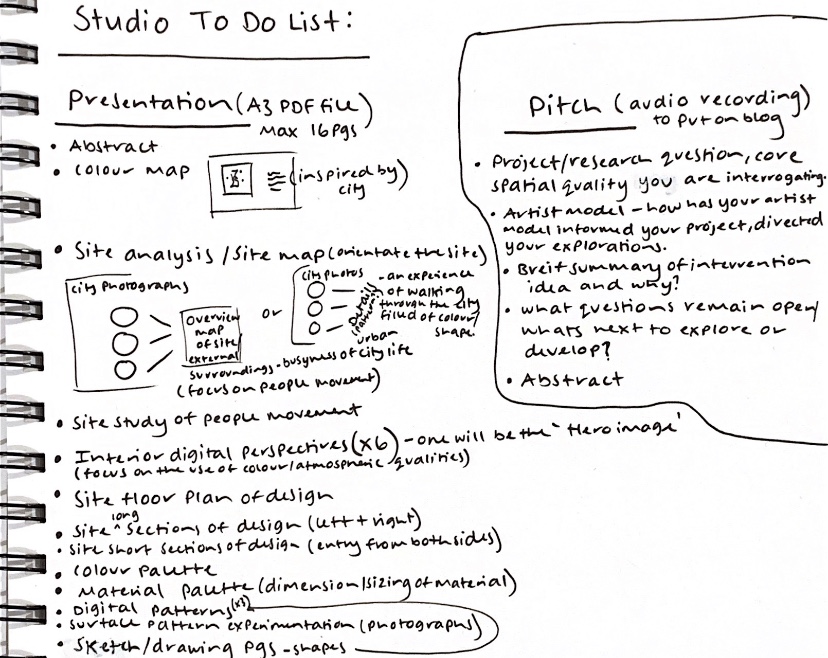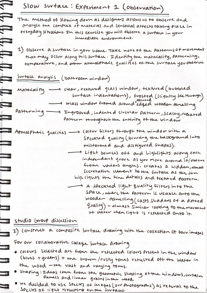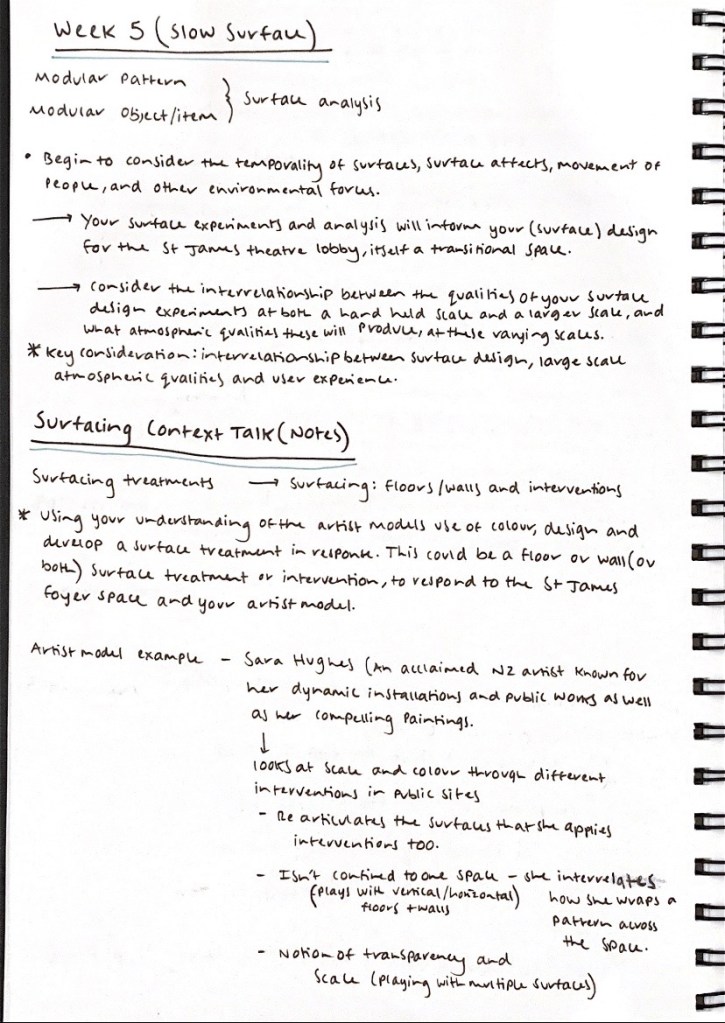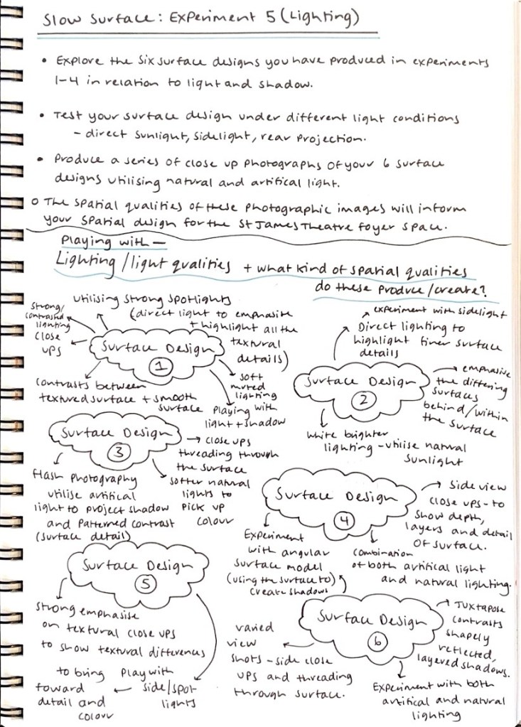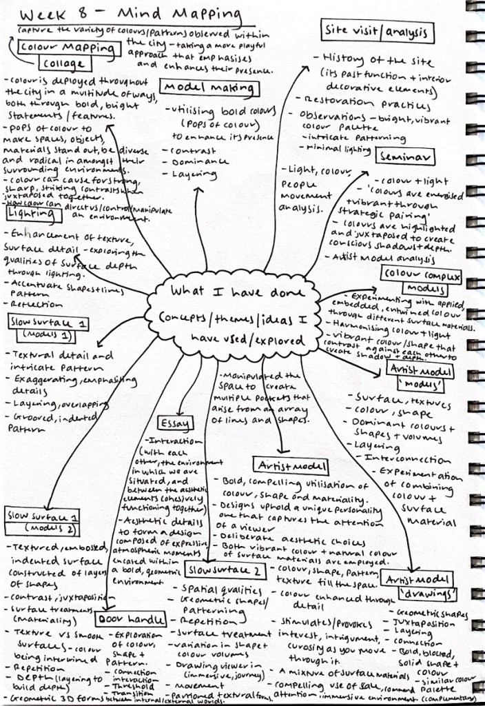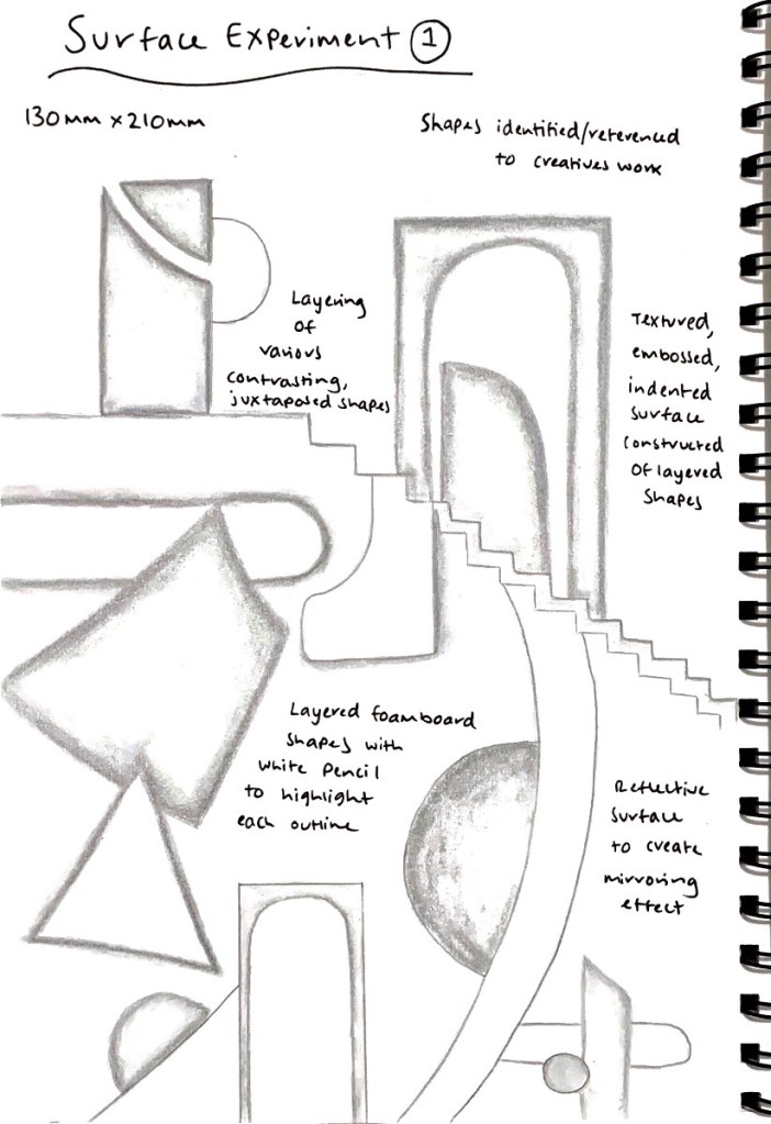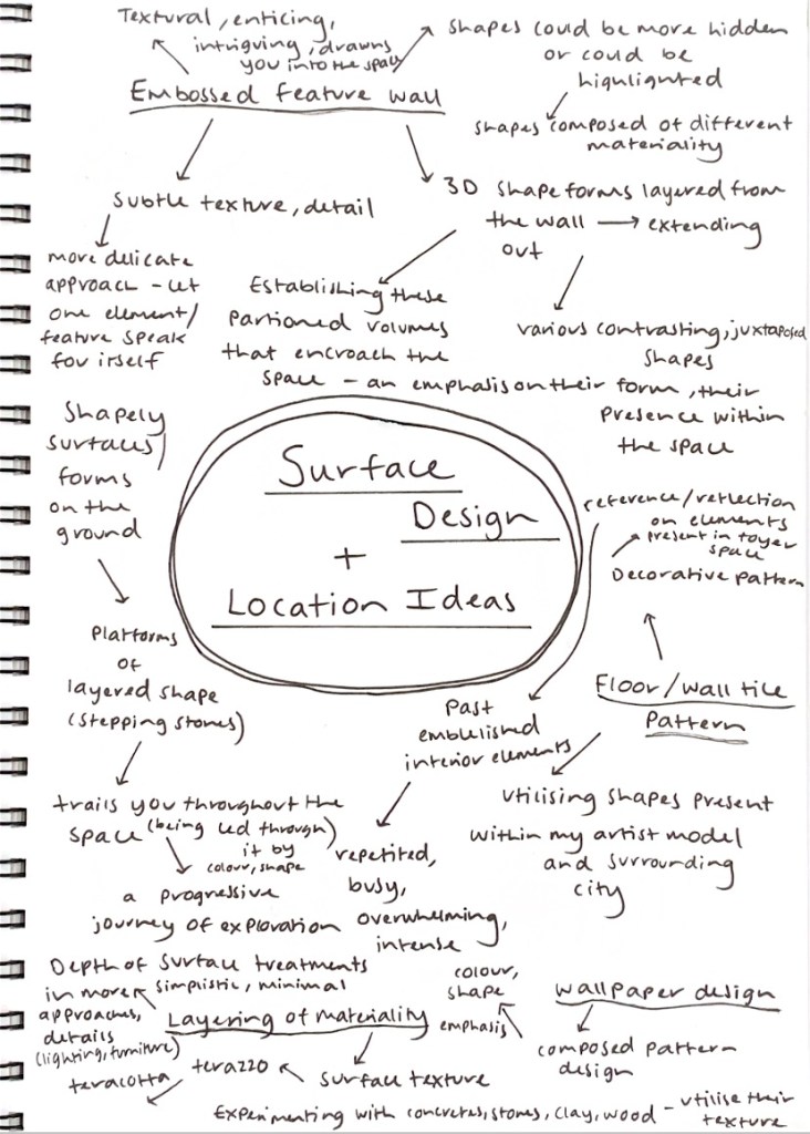 In order to begin to correlate and establish some key ideas for surface treatments, designs and potential locations of placement, I decided to formulate a mind map brainstorm jotting down an array of possible surface ideas I could implement within my design intervention and the kind of impact it would have within the space. Taking into account how colour, shape, pattern, materiality and texture would be influential or inclusive within these surface treatments. What role would they play within my design? How would the location, size, scale of my surface design impact the inhabitants experience within the space? What kind of relationship do I want them to establish between not only the surface treatments but the overall space itself? Beginning to consider the kind of immersive experience I wish for people to encounter and feel, the spatial qualities in which I am exploring.