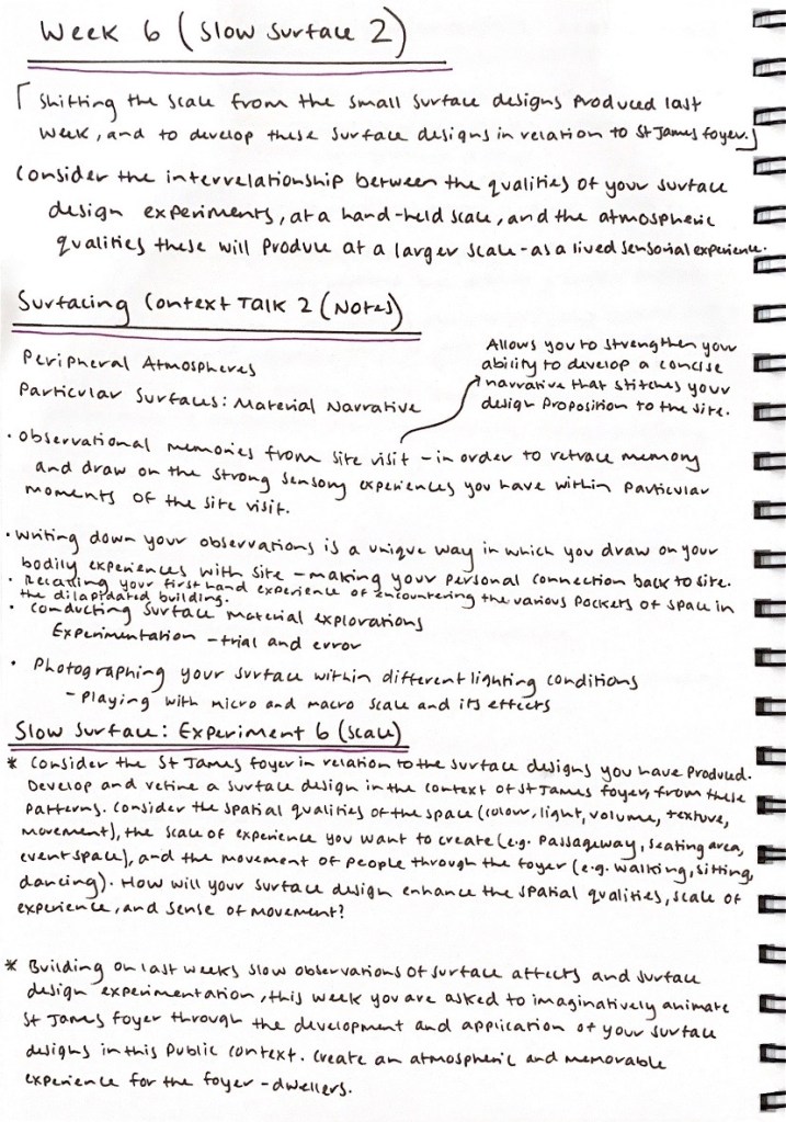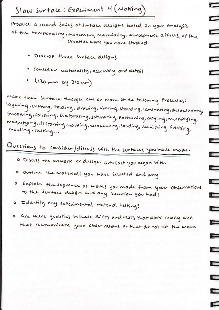 Overall these Slow Surface exercises were a great way of further exploring, developing and applying a variation of surface treatments and how important it is to perceptively think through each aspect within the design considering its detail, pattern, colour, materiality, size, scale, placement as all these elements coherently work together to establish impact on both the space and its inhabitants. From these experiments I will continue to further develop, extend and progress my design ideas and other possible surface treatments in which I could employ within the space. These explorations have allowed me to start to question what exactly do I want the space to look like? What components, features, aspects to I wish to emulate within my design intervention? How will I implement colour, shape, pattern, texture within my design so that it has meaning, purpose, conceptual backing and most importantly has impact on both the space and the people moving through it?