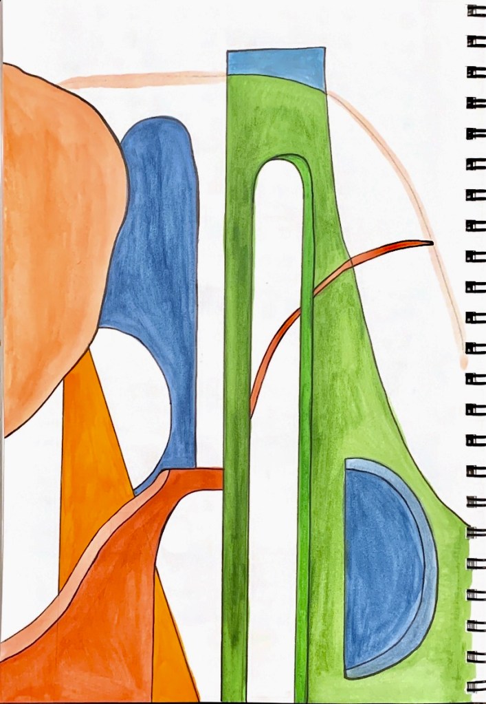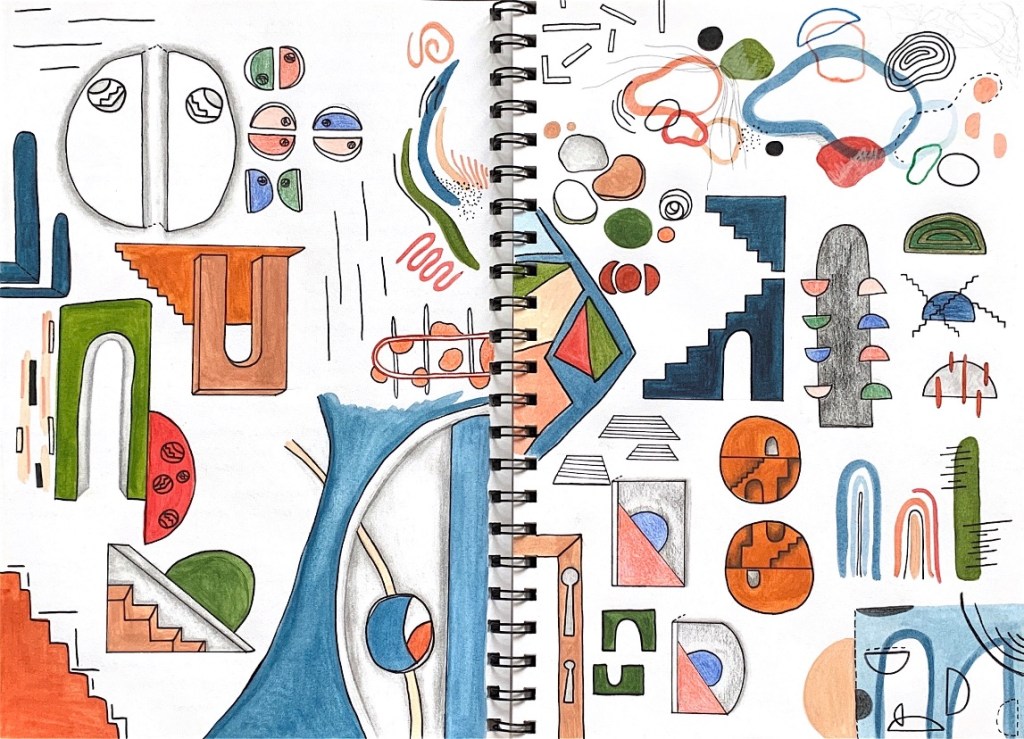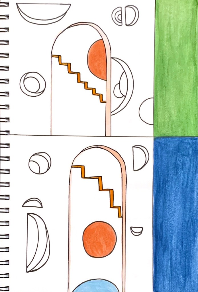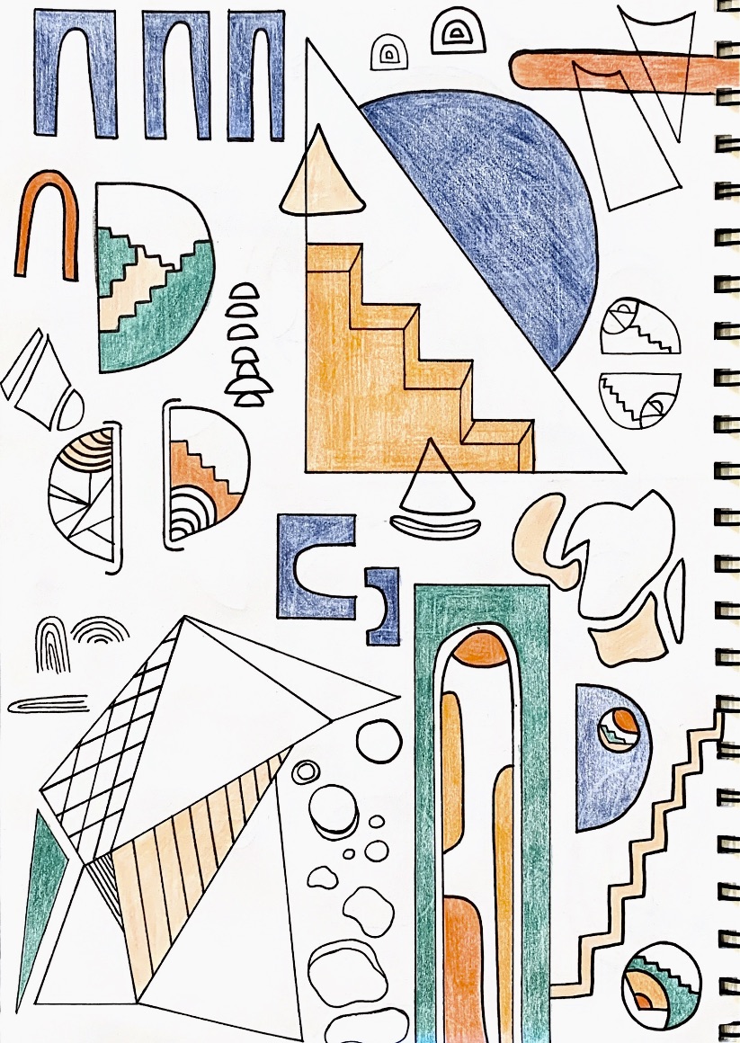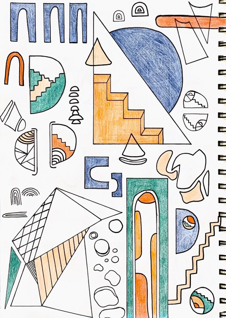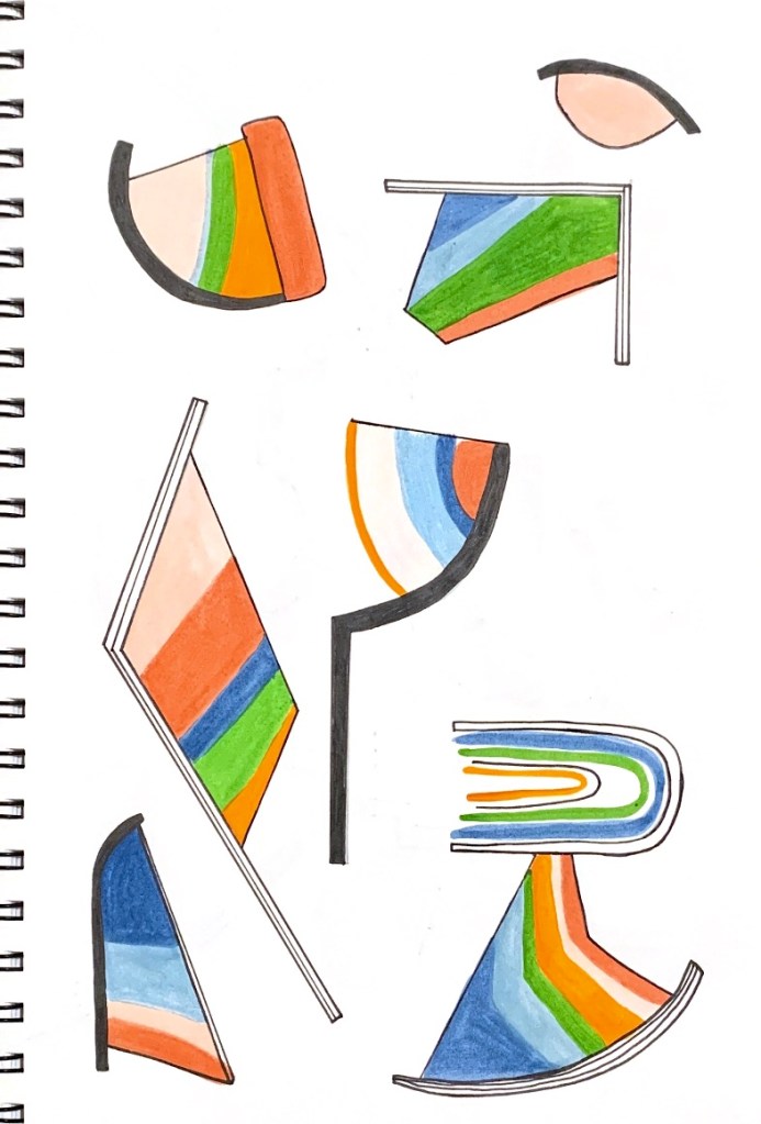 Each drawing highlights the array of geometric shapes and lines present within my artist model’s work. I wanted to explore both the juxtaposition and the cohesion between the shapes and their specific colours. I decided to play around with layering, connection, pattern and bold, blocked shapes in contrast to more shapely outlines. All drawings sequence very similar colour palettes containing both warm and cool tones. The selected colours I chose to use are the warm rusts, and oranges as well as deep blues present within ‘The Geometrication’ space. I also decided to include tones of green and pink in order to establish an intriguing colour palette, one that will provoke interest as well as be complementary within my design intervention and the existing foyer space.