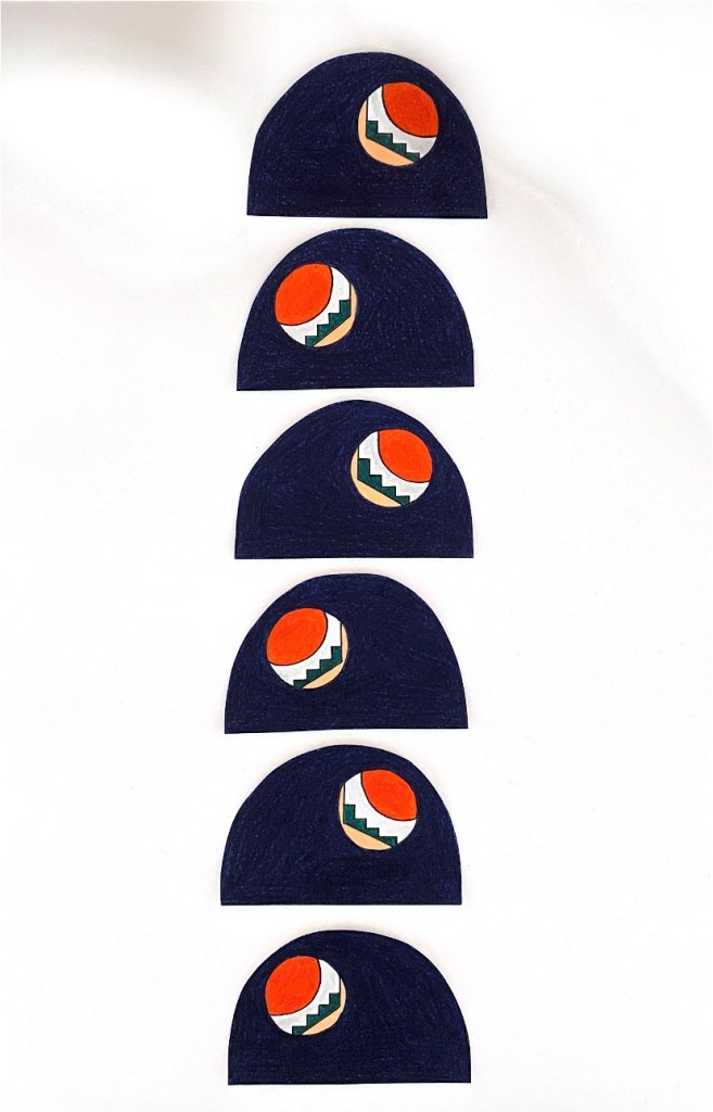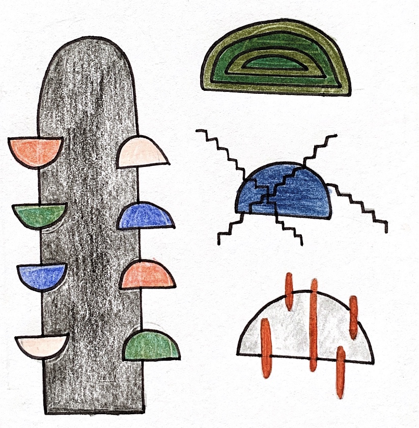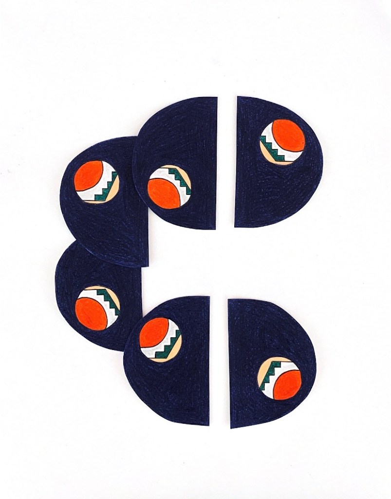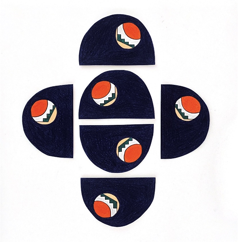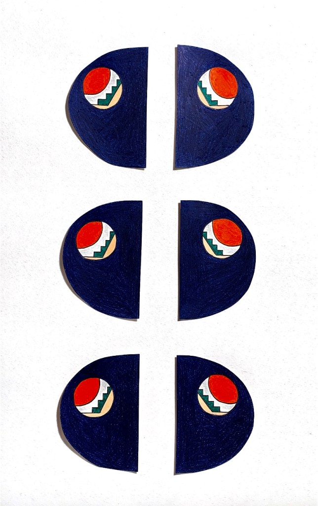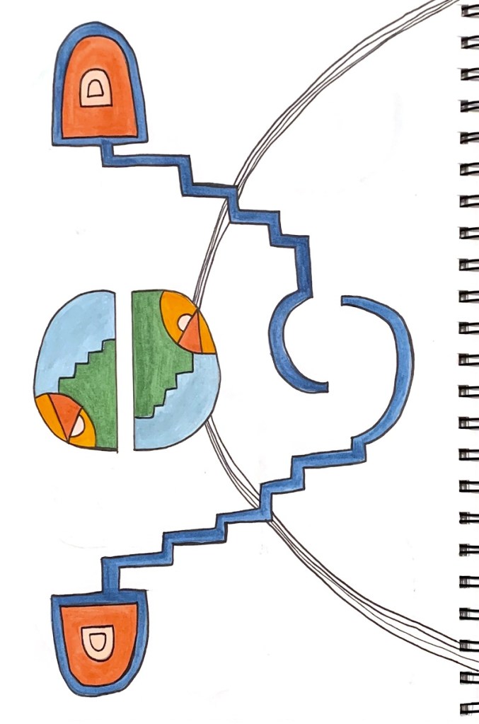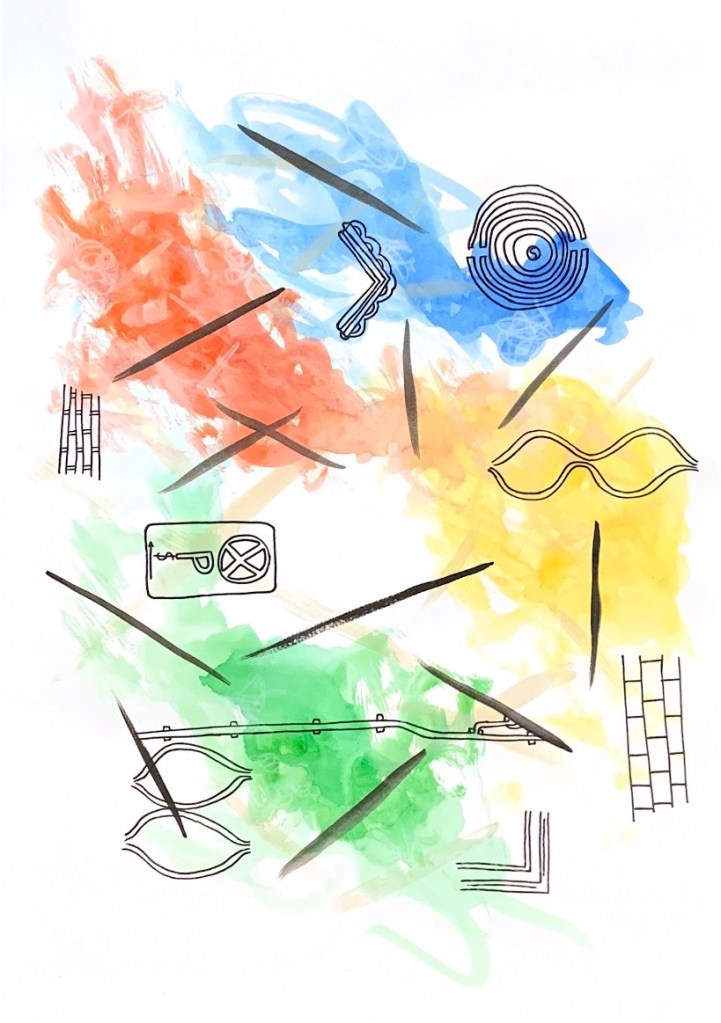 Each drawing highlights the array of geometric shapes and lines present within my artist model’s work. I wanted to explore both the juxtaposition and the cohesion between the shapes and their specific colours. I decided to play around with layering, connection, pattern and bold, blocked shapes in contrast to more shapely outlines. All drawings sequence very similar colour palettes containing both warm and cool tones. The selected colours I chose to use are the warm rusts, and oranges as well as deep blues present within ‘The Geometrication’ space. I also decided to include tones of green and pink in order to establish an intriguing colour palette, one that will provoke interest as well as be complementary within my design intervention and the existing foyer space.