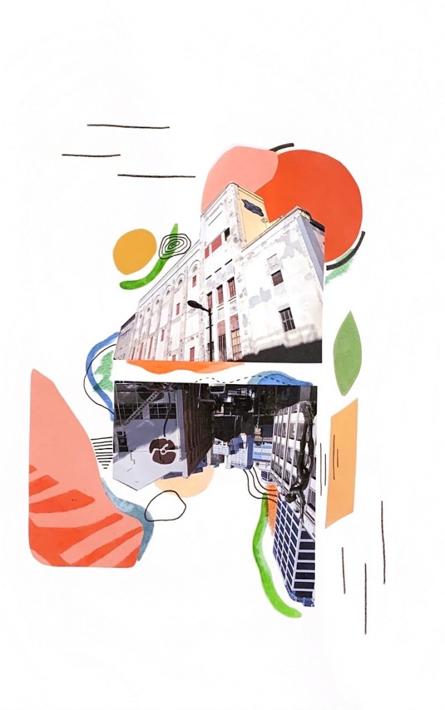 For my final colour collage I incorporated together and experimented with a range of colours, shapes, line and pattern. Applying my observations of colour within the built city environment, my collage consists of bold, contrasting colours such as vibrant warm tones of red, mustard yellow and pink as well as deep blues and sage greens. My collage composition focuses around a mirrored layout where I have used photographs taken of the St James Theatre and cityscape from our class walk in the city. Surrounding the images I have juxtaposed solid coloured shapes against black ink line patterns in order to frame and merge together both building photographs. In my collage I wanted to capture the variety of colours and patterns I observed within the city, yet taking more of a playful approach that emphasises and enhances their presence.