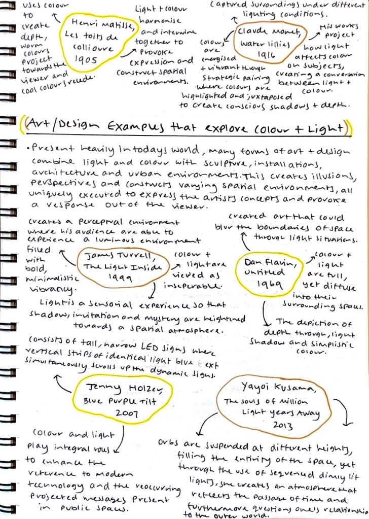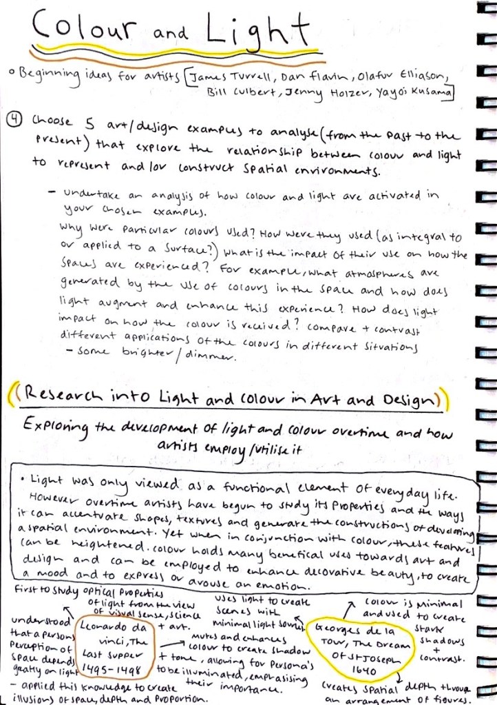 For my specific research question on Colour + Light surrounding different artist model examples, I developed analysis pages summarising my gathered research and findings. This research I will implement and use in our groups seminar presentation. Featured below are some of the main resources I used for my research investigation into Colour + Light.