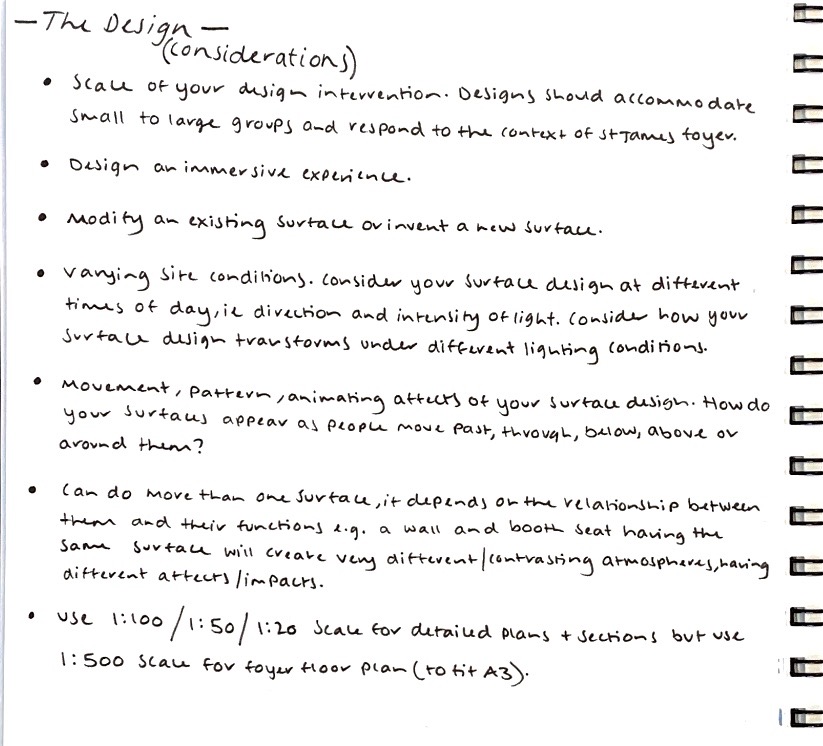 Today in class we began the workshop with a context talk surrounding site analysis and some important tips and insight into site documentation and how to compile a sequence of drawings that communicate our key findings. Some of these tips were to pace it out, sketch lots (focusing on key elements and areas of interest), scale, use a range of mediums and layering for exploration, and finally measure things with your body as its much easier to remember when its in relation to you. Constructing a productive, in depth site analysis of the St James Theatre will allow us to understand the space, its characteristics and conditions as well as patterns of behaviour and experiences that circulate it.