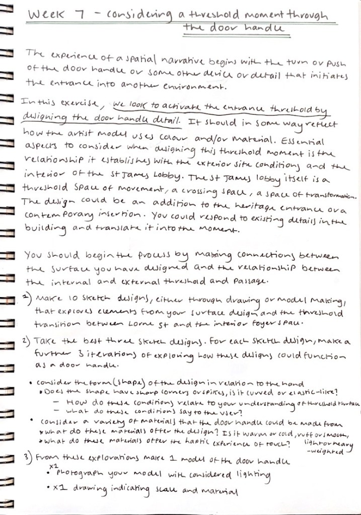 In this weeks exercise we are looking to activate the entrance threshold by designing the door handle detail. The experience of a spatial narrative begins with the turn or push of the door handle or some other device or detail that initiates the entrance into another environment. This designed detail should in some way reflect how our chosen artist model uses colour and/or material. Essential aspects to consider when designing this threshold moment is the relationship it establishes with the exterior site conditions and the interior of the St James Theatre foyer space.