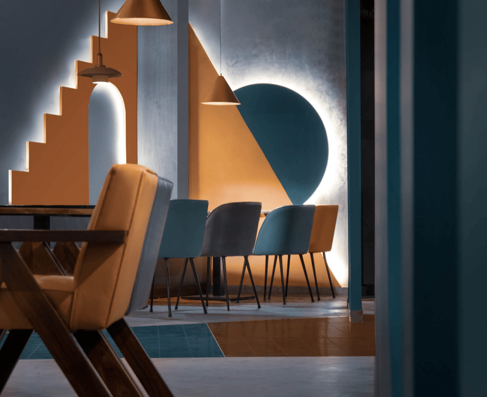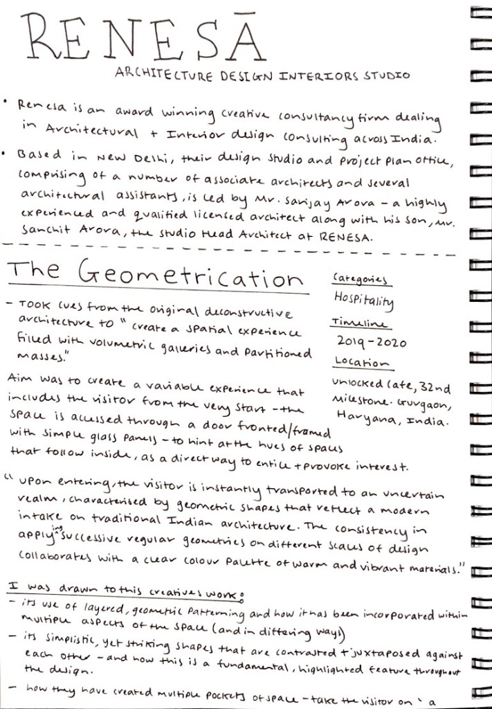 After researching and analysing various creative works by Renesa Architecture Design Interiors Studio, the work I selected to be my main, influential source and inspiration for my own design intervention is ‘The Geometrication’. I was drawn too and chose this particular work because of its use of layered, geometric patterning and how it has been incorporated within multiple aspects of the space (and in differing ways). How a highlighted feature throughout the design is its simplistic, yet striking shapes are that contrasted and juxtaposed against each other. I was fascinated by their creation of multiple pockets of space, where they take the visitor on a fragmented journey that is intimate yet provokes a dynamic, bold and lively atmosphere. Their deliberate choices towards each aesthetic element has led to a design where the relationship between colour and materiality is coherent, a concept I wish to explore and develop further.