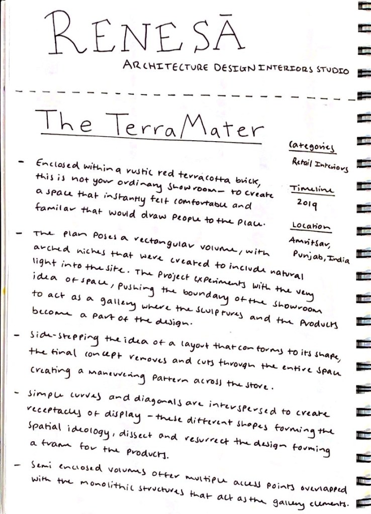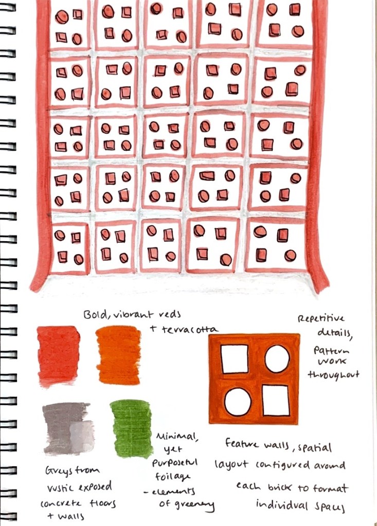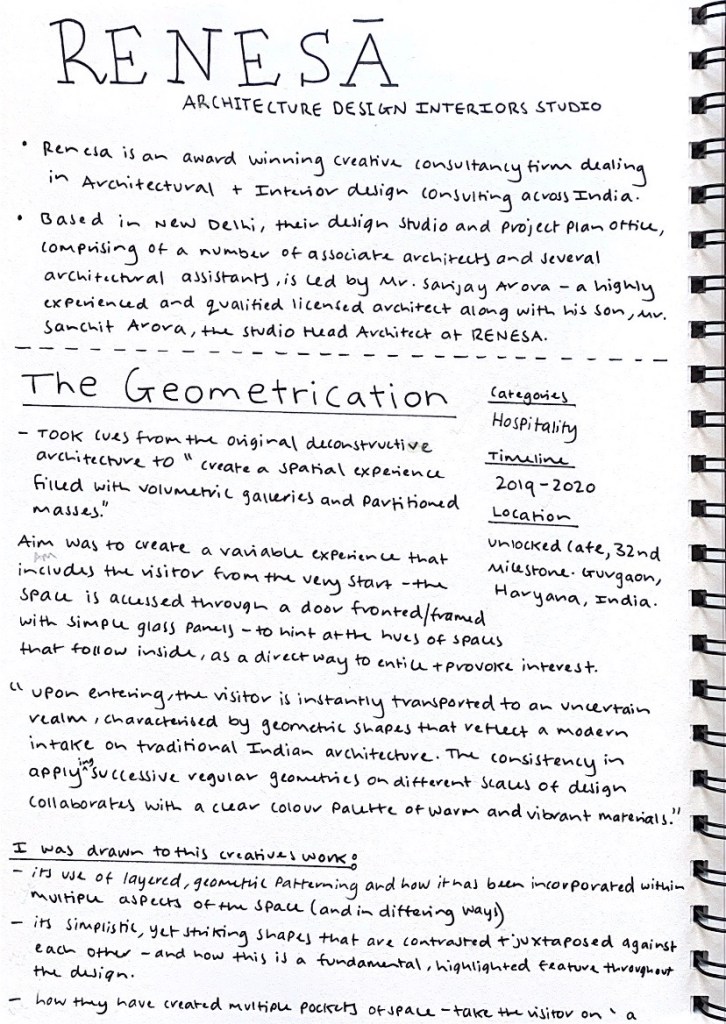 My chosen artist model that will influence my design is Renesa Architecture Design Interiors Studio based in New Delhi, India. I was drawn to their overall design aesthetic, their ability to implement texture and pattern within a space, as well as their bold, compelling utilisation of colour, shape and materiality.