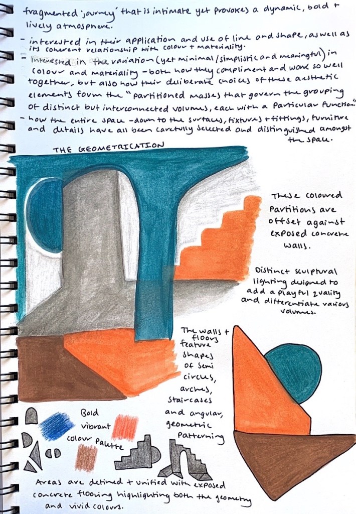 The artist model and work that I chose to help inform and further develop my project was Renesa Architecture Design Interiors Studio work ‘The Geometrication’. I was particularly drawn towards their application and utilisation of colour and shape, as well as their ability to establish an effective relationship between colour and materiality. Their design decisions to integrate a diverse collection of materials and surface finishes into their work, allowed for the creation of a compelling space that upholds greater depth, intriguing the viewer at the hues of the interior that follows inside. I was intrigued by their notion of developing a space that ‘takes the visitor on a fragmented journey, in order to create a kind of immersive, variable experience’. All of their creative designs have their own unique personality that draws the attention of a passer-by and transports them into a dynamic, spatially constructed environment. Their unique usage of these design and spatial qualities helped to stimulate not only my own interests in the utilisation of these elements, but also my comprehensive explorations into colour and shape in this new profound way. Where I am considering how these aesthetic details can be implemented within a spatial environment in order to create a distinctive design.