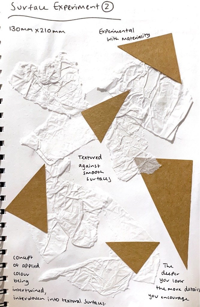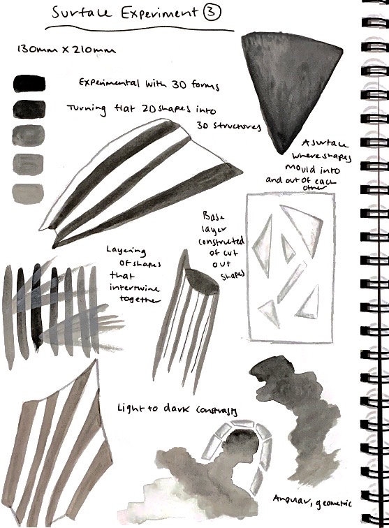 As part of our informal presentation to show others what we have been working on and the different surface treatments we are exploring and experimenting with, I constructed an A3 drawing composing of the influential and progressive elements that allowed me to formulate through an exploration of ideas.