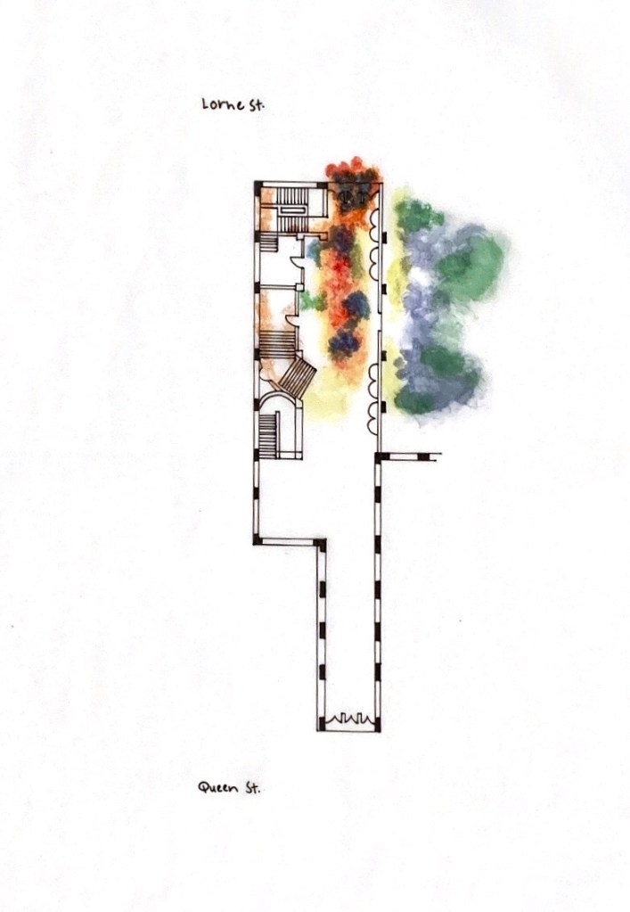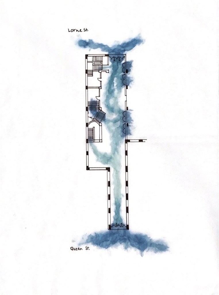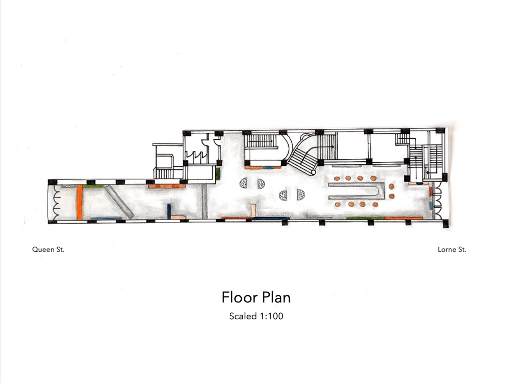 Once I had established my final design intervention after multiple design iterations and explorations, I began to construct my detailed site plan drawings of my intervention within the space. As part of my series of site drawings I wanted to include sectional elevations of the entry/exit accesses into the space, from both Queen Street and Lorne Street as these transitional thresholds are a major part of generating the spaces atmosphere along with captivating interest, enticement in the passerby and their first impressions amongst entry. These thresholds are also the connecting elements between the space and the external city environment, a moment where these environments interconnect.