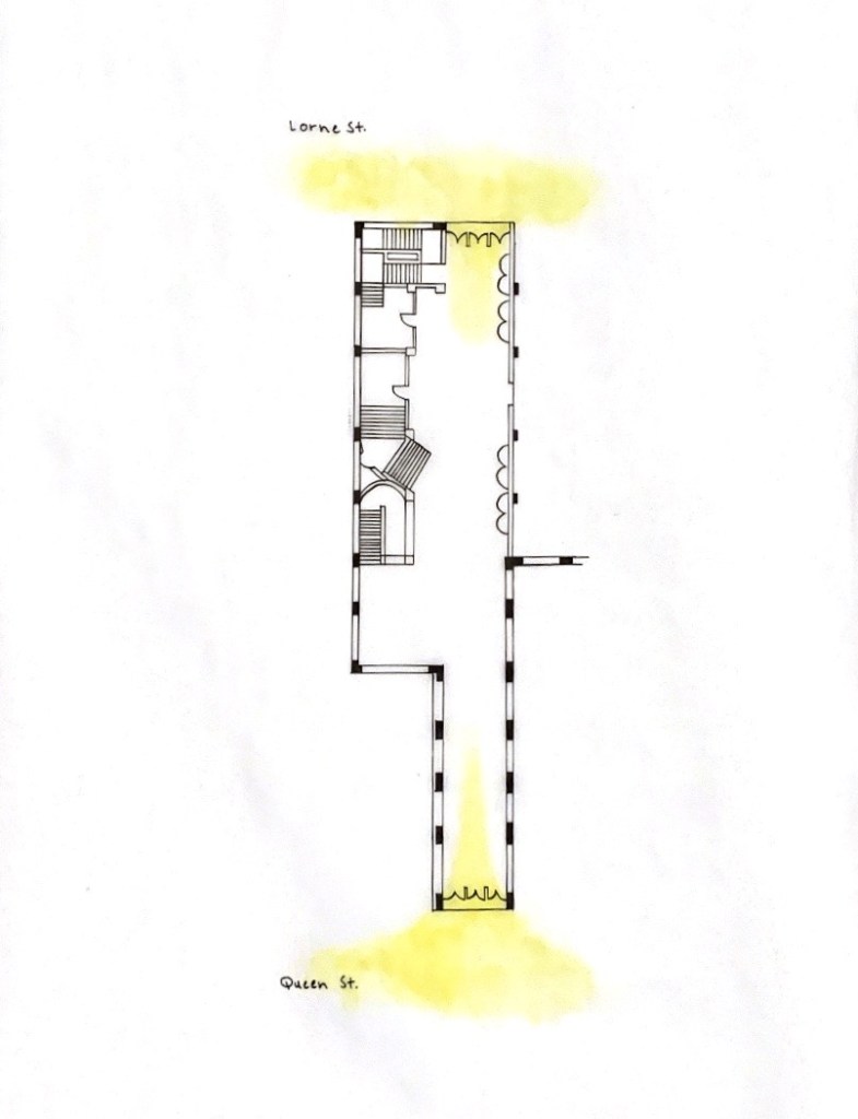 This site floor plan explores where natural light enters into and transfers within the St James Theatre foyer space. During our site visit we were only able to access a section of the space however I understand that there are entrances from Queen Street and Lorne Street, both being the main access points where natural light enters. Due to the natural light sources being present at either end of the site, this means that minimal light reaches the centre of the space. When considering my future design, I will aim to utilise the natural light as well as assess ways in which I can employ additional light into the site.