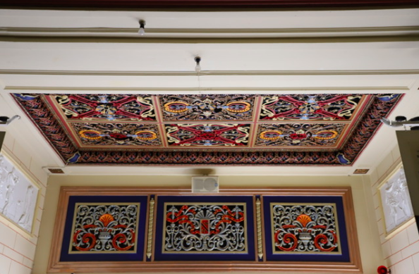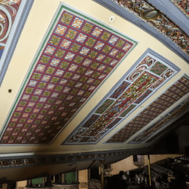 Whilst observing the site I noticed its bold, vibrant colour palette consisting of deep blues, reds and yellows. Majority of colour present in the theatre was through the walls and ceilings which were decorated with busy yet intricate patterning. Lighting within the theatre was quite minimal, as I observed multiple areas within the site that lacked natural lighting. A lot of spaces in the theatre are dark and inclosed so aspects of artificial lighting will need to be included. In the foyer space there are doorways at either end allowing for sunlight to stream through that specific area.
