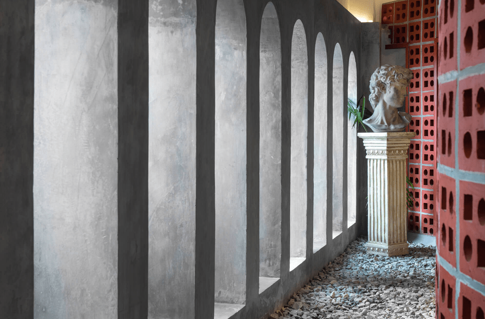 Materiality + Surfaces – Patterned terracotta brick, exposed concrete floors and walls, foliage elements, marble, stone.