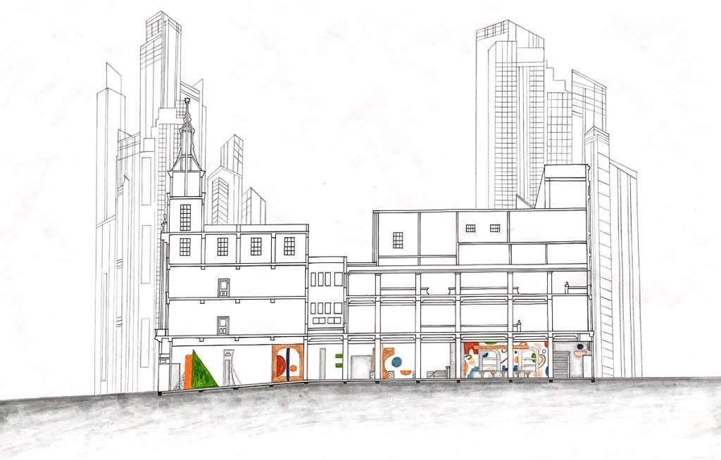 Once I had finalised my interior perspective views, I wanted to focus on developing and finishing my other site drawings, my floor and section plans of my design intervention. Both these site plans I wanted to keep fairly minimalistic as I wanted the full focus and attention to be on my design and its incorporation into the exisiting space. However in my section plan I did decide to include external buildings as I wanted to connect the St James Theatre in relation to its contextual orientation, by it being located in amongst a built, city environment.
