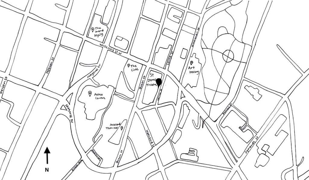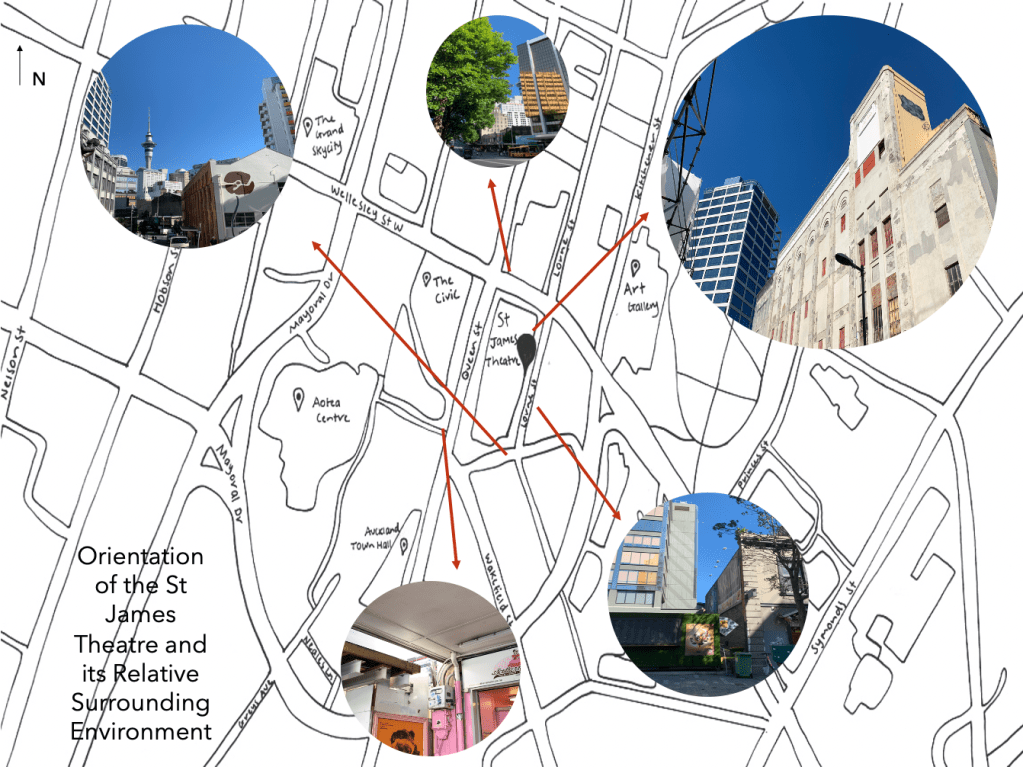 I began my site analysis by mapping out the location and orientation of the St James Theatre within Auckland city’s built environment, the pathways, routes that intertwine, interact, merge and connect within the city, in order to develop a greater understanding of its contextual position and connection to its external surroundings. I also decided to highlight out some other key buildings that uphold a similar function and purpose to the St James Theatre such as other performing arts theatres like The Civic and Aotea Centre. The array of these kinds of buildings present within the city environment showcases just how influential and meaningful they are towards creating and establishing a major part of the city’s urban atmosphere.